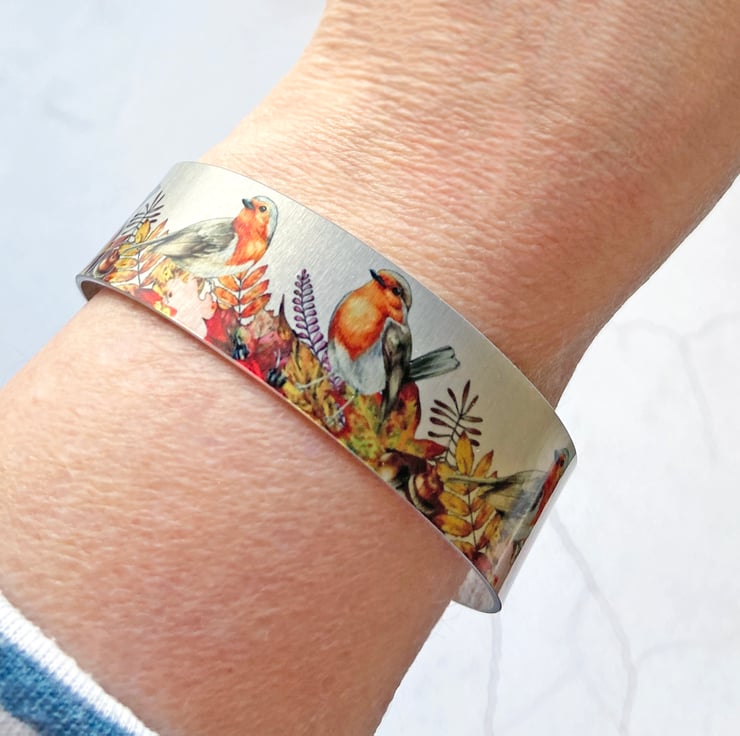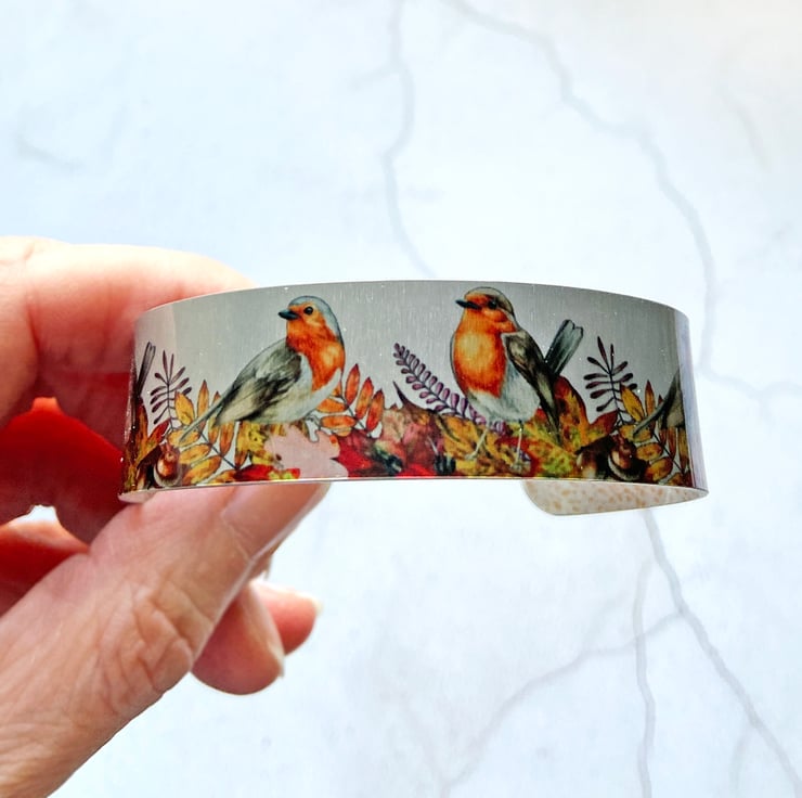 Robin cuff bracelet with leaves and foliage. Handmade jewellery, made in Northumberland and would make an ideal gift for a bird lover. In addition, for a small fee, a personal message can be engraved on the reverse (Optional).