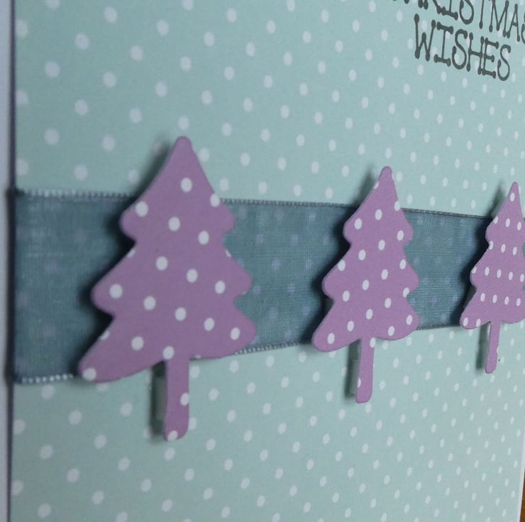 Squares of polka dot card have been wrapped around the centre with a length of organza ribbon and 3 die cut Christmas trees have then been attached, raised on foam to add dimension. The greeting Christmas Wishes has been hand stamped at the top in black archival ink.