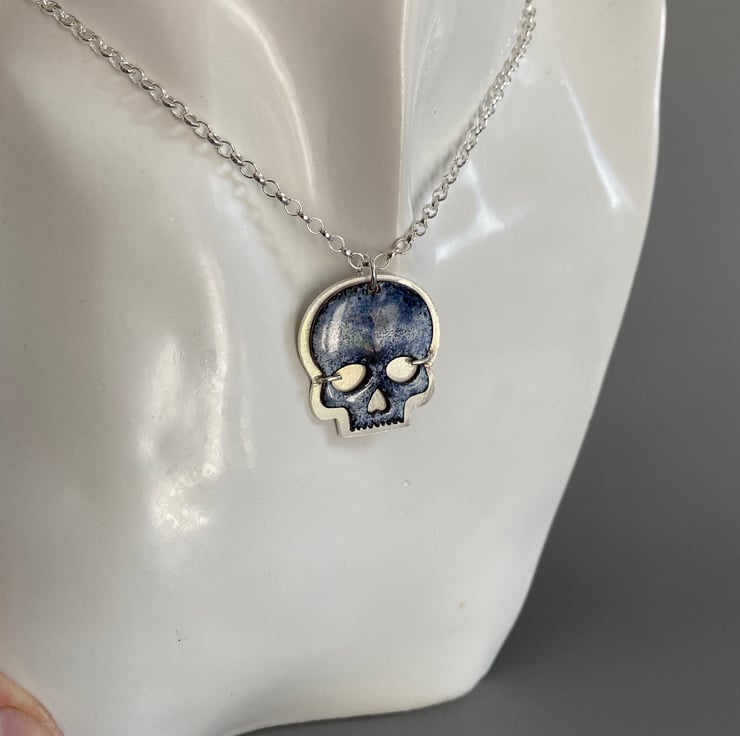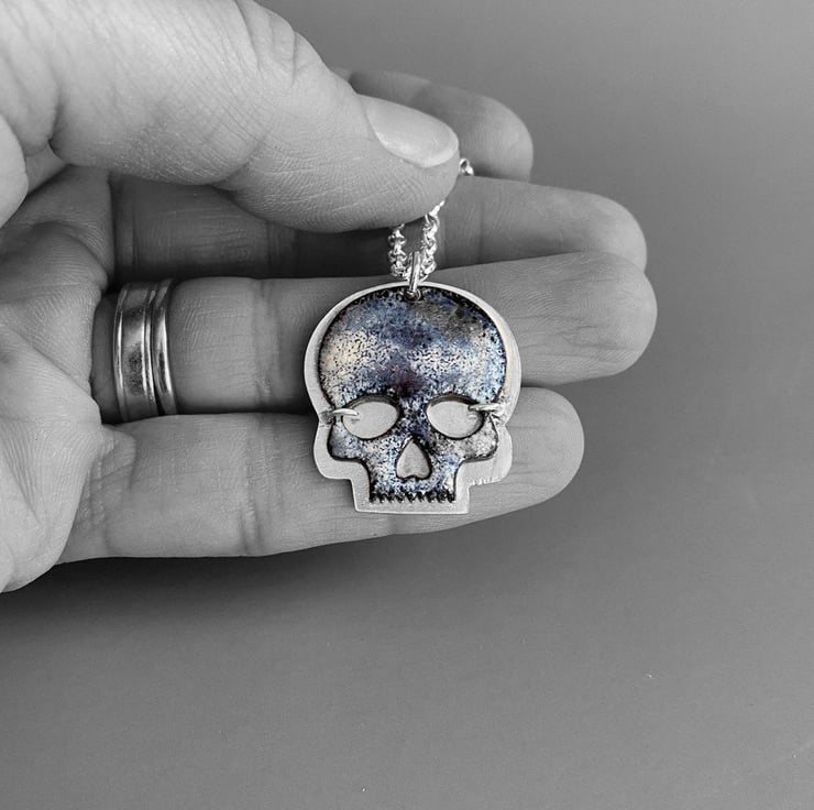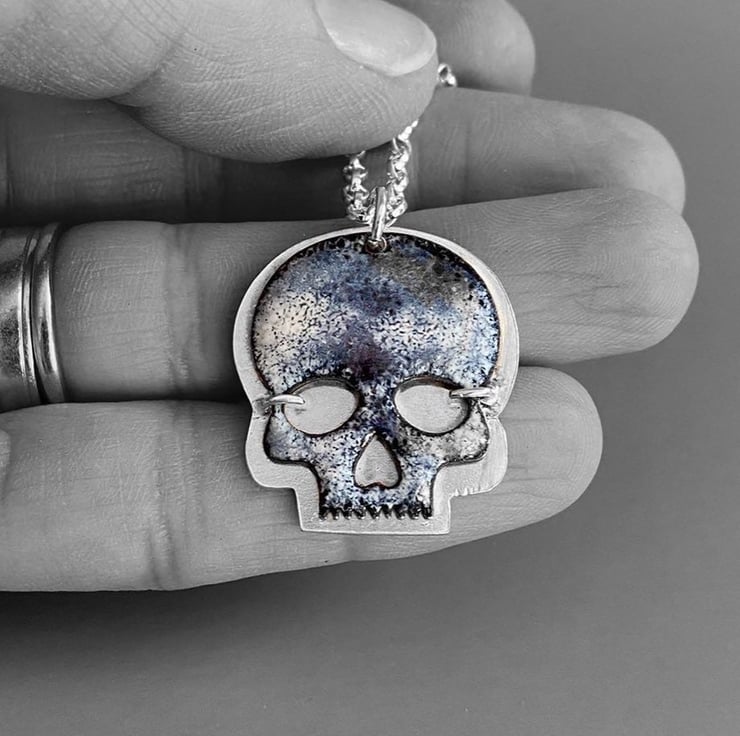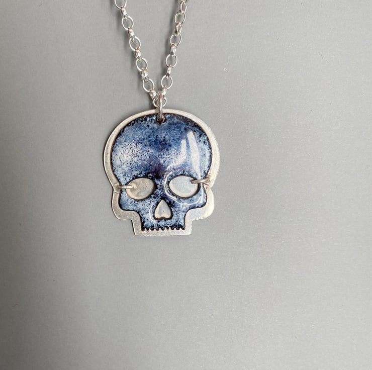 The skull is made in copper and enamelled in a mix of black and white. Each piece is fired up to four times before being set on a backplate of sterling silver and hung from a sterling silver chain.