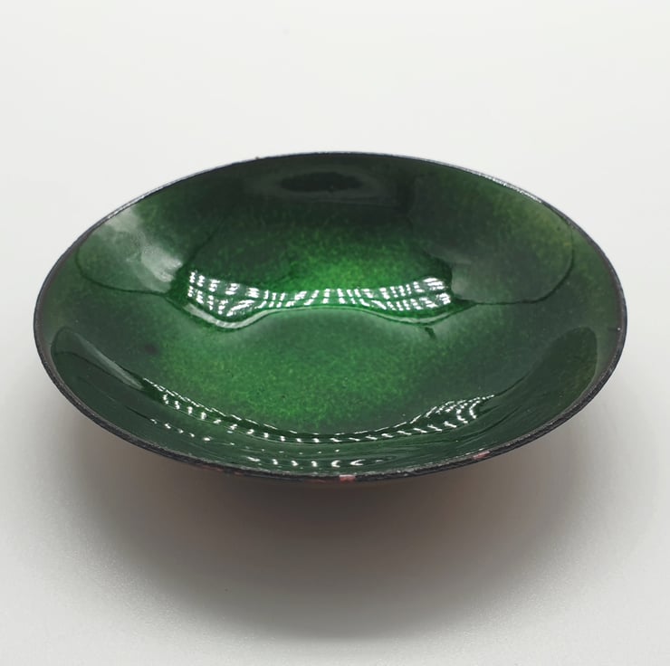 A stunning emerald green copper enamel bowl, kiln fired to achieve this beautiful depth of colour.