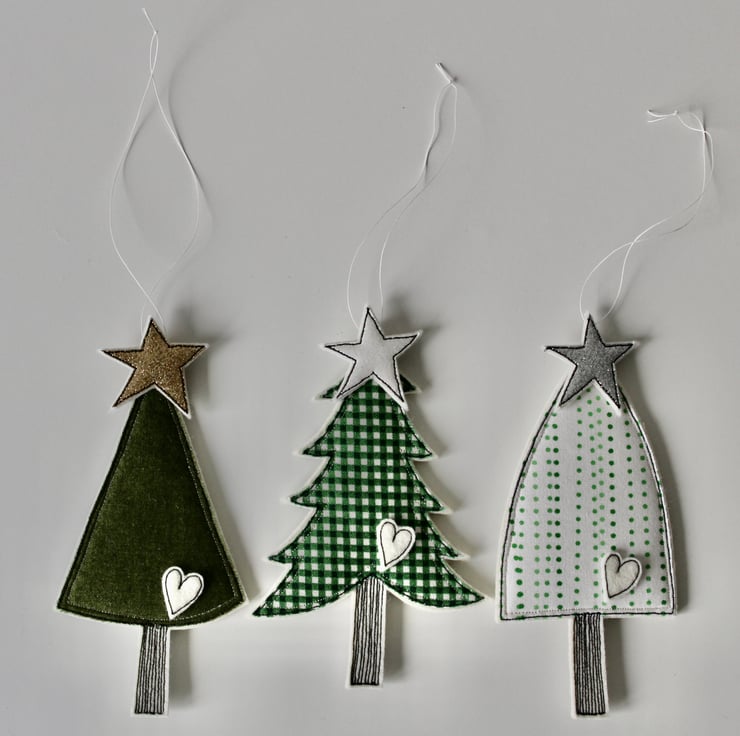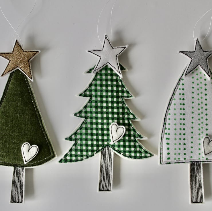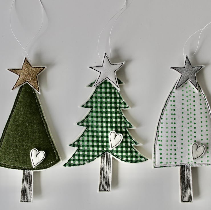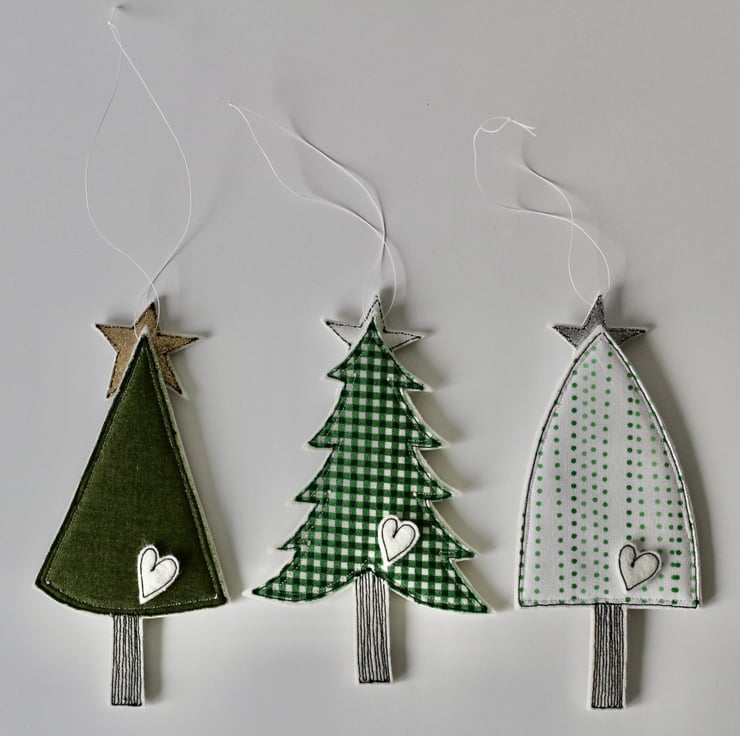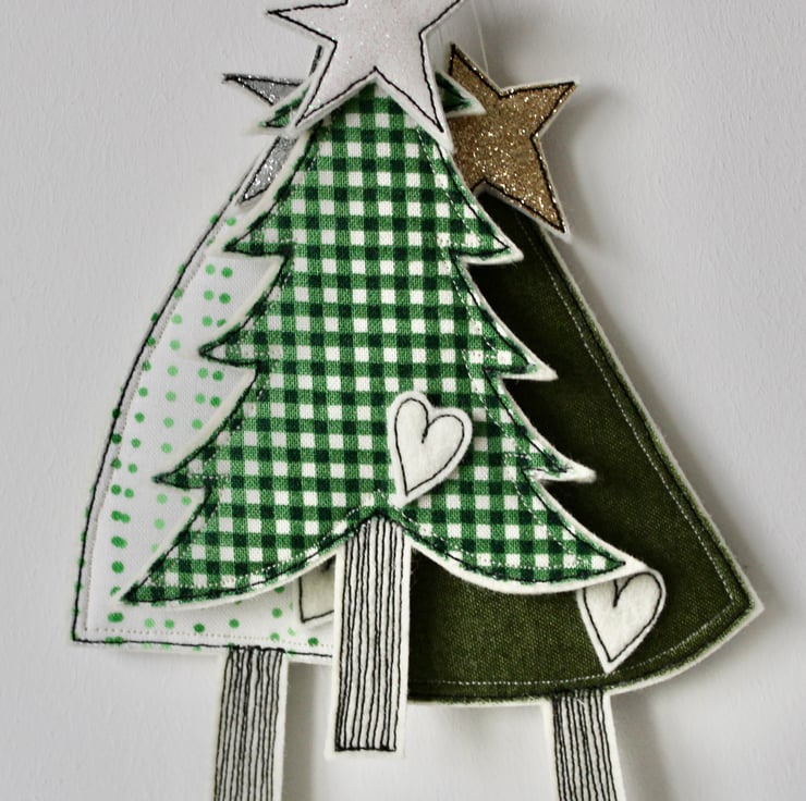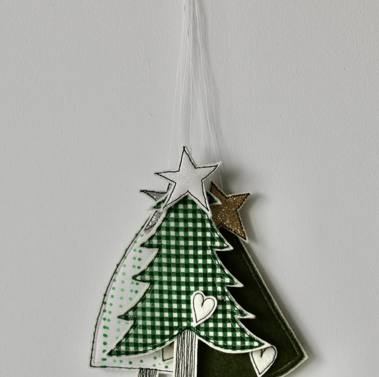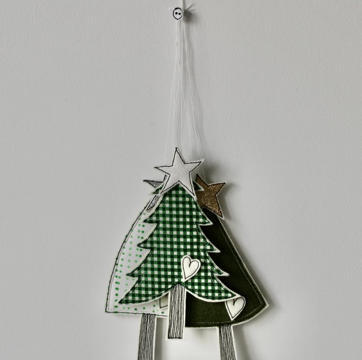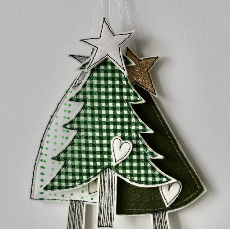 Delightful hanging decorations which are created using 100% wool felt, cotton cloth, glitter cloth, free hand machine embroidery and cut out by hand, using a very sharp pair of scissors.