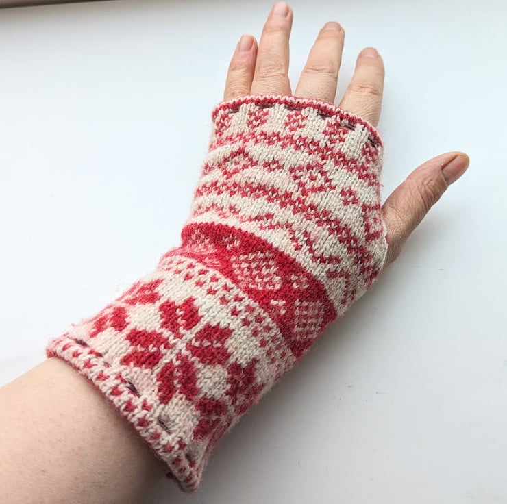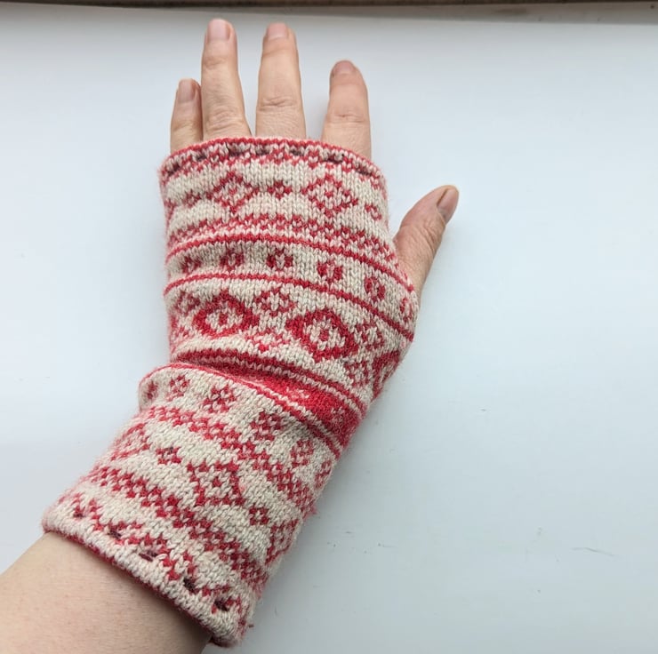 MISMATCH Nordic Red and Cream Wrist Warmers Upcycled from Wool Jumper