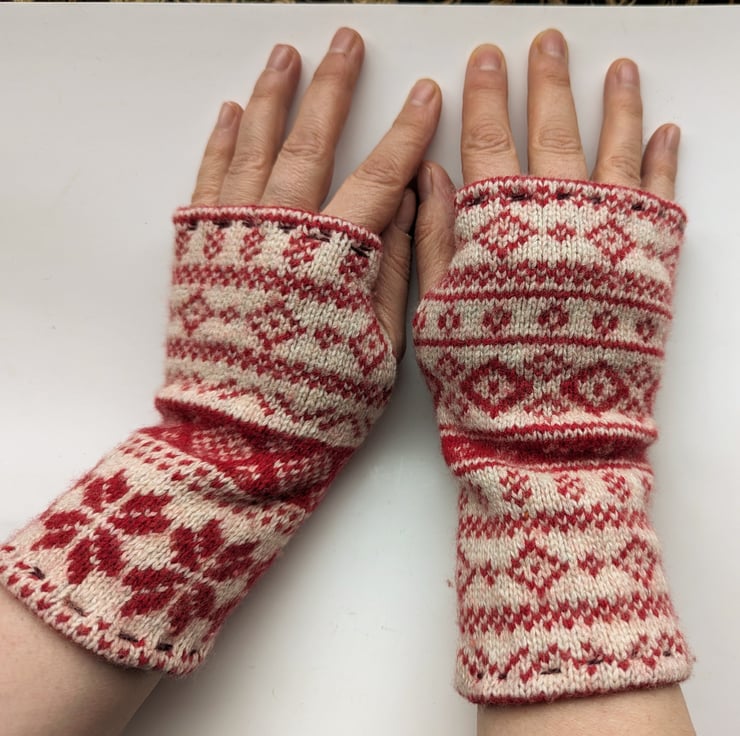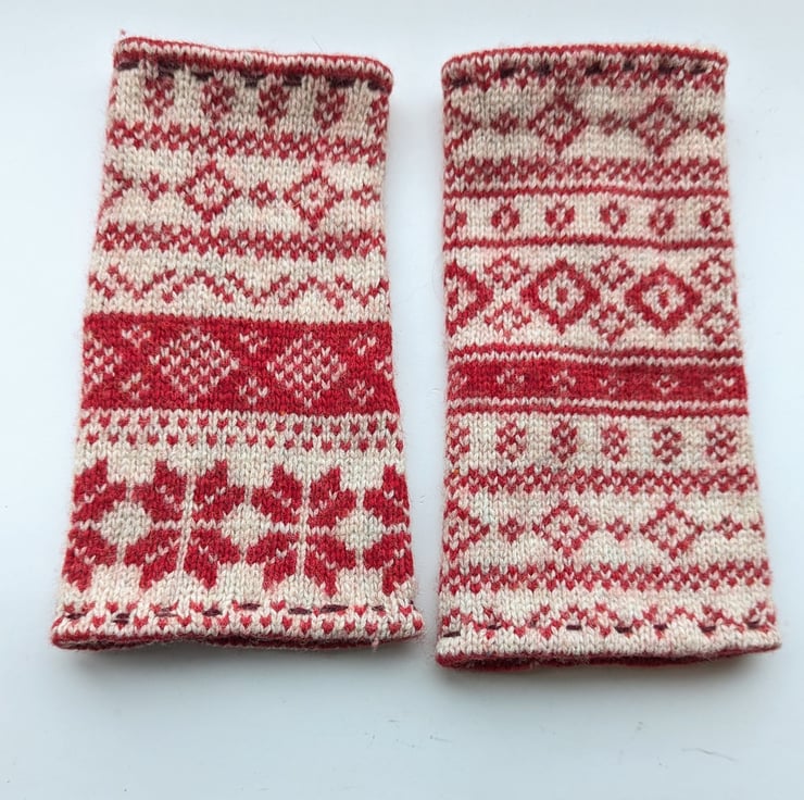 Made from secondhand jumpers with 50-100% wool content so advise only washing by hand. Each jumper yields only 4-6 pairs with a variety of pattern and cuff, so when they are gone, they are gone. See other listings for alternative colours and patterns.
