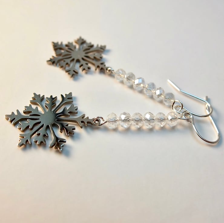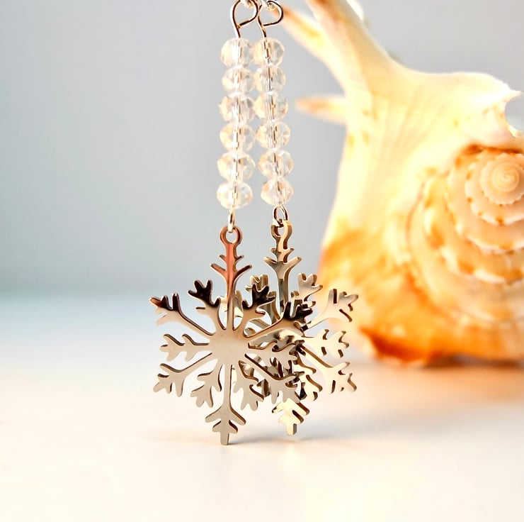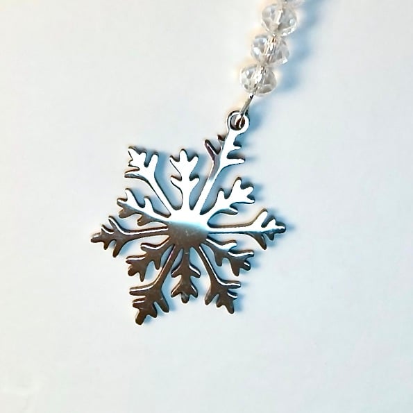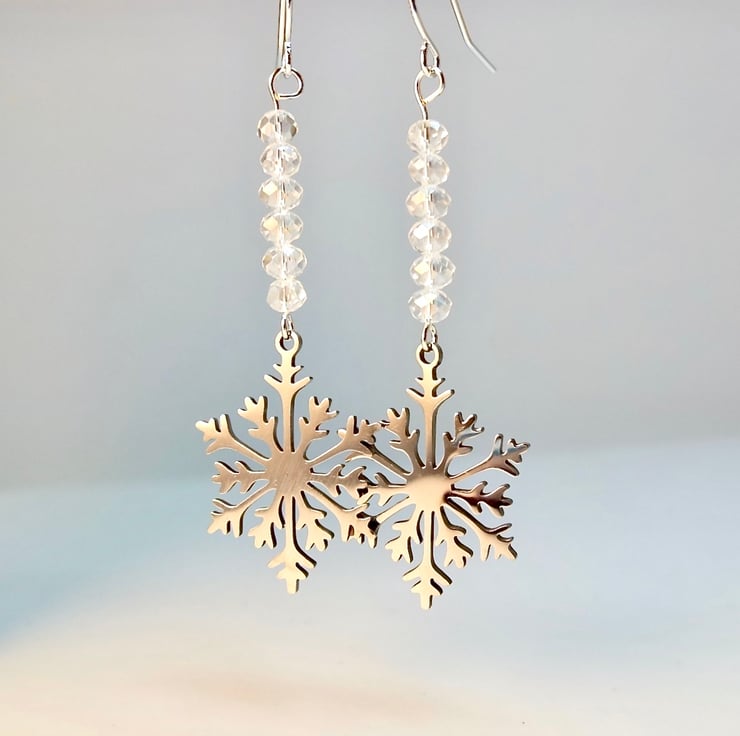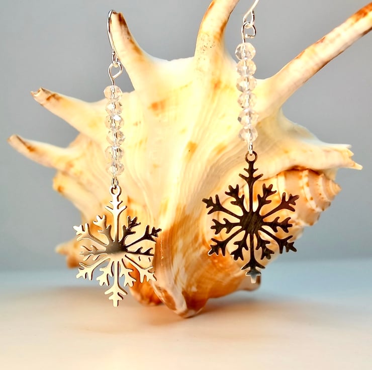 Laser cut, stainless steel snowflake charms measuring approximately 19x25mm topped with six very sparkly, clear, faceted crystal rondelles.