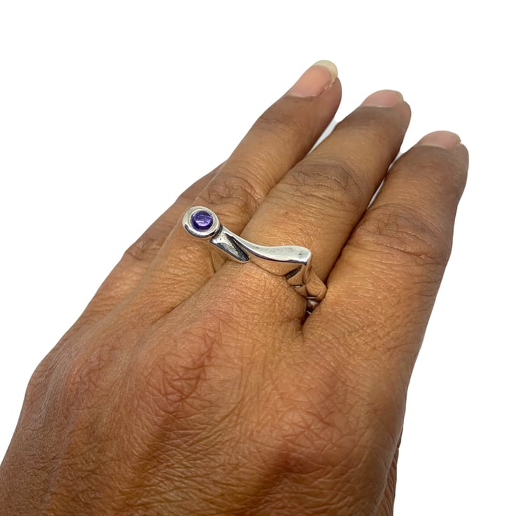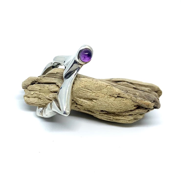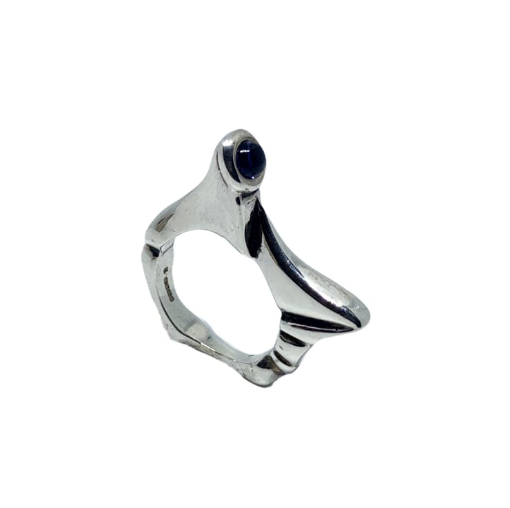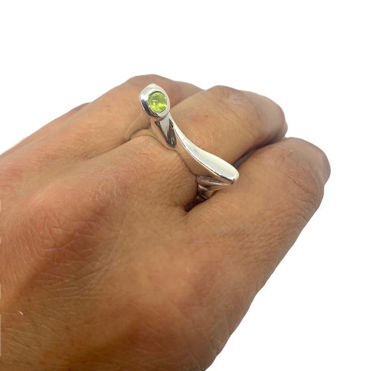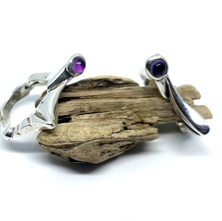 Hand carved from a block of lost wax and than casted in sterling silver 925 with the choice of round green peridot, amethyst or blue iolite cabochon.