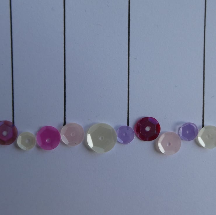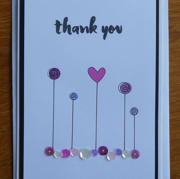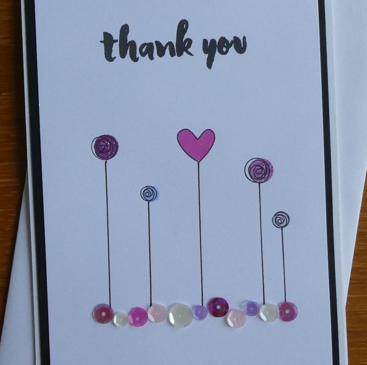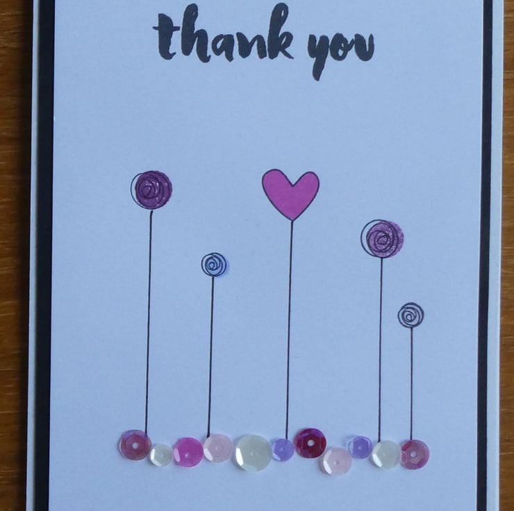 This thank you card has a black, hand stamped thank you message in a brush stroke style font and hearts and flowers above an undulating row of sequins in shades of pink, purple and white.