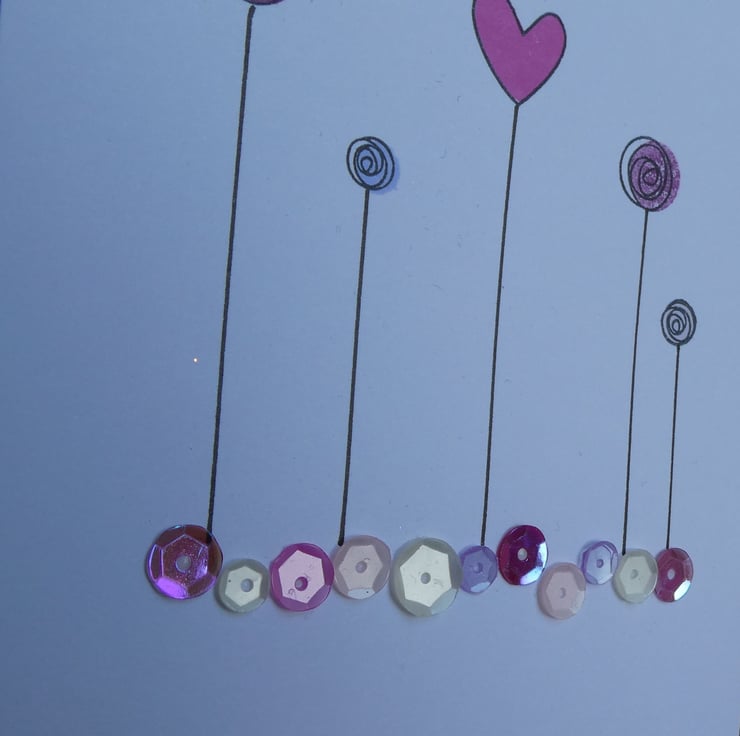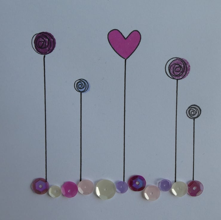 As each card is hand stamped and coloured individually the stamping and colouring are almost identical on each card but the exact colour and positioning of the sequins will vary.