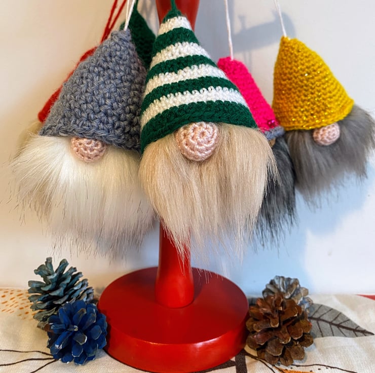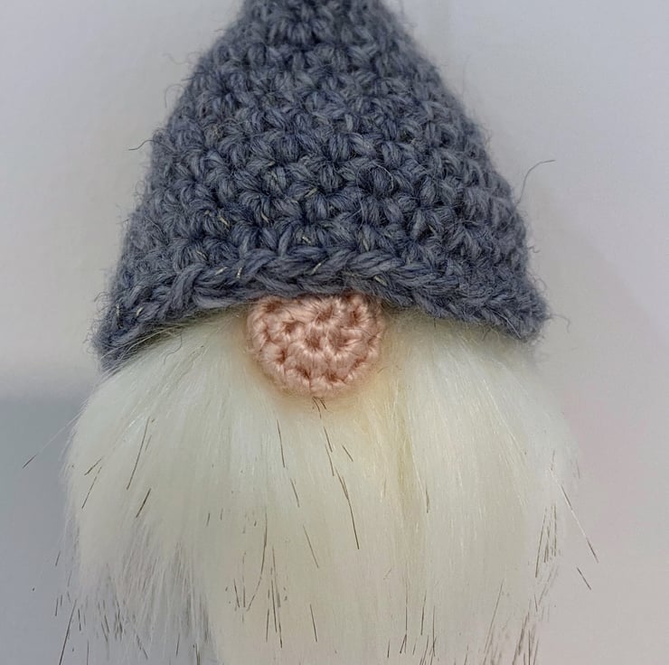 Hand crocheted gonk / gnome Made with acrylic yarn and faux fur pom pom. Yarn includes light reflecting particles for a sparkly effect. Unique, one off design. Perfect for Christmas tree and seasonal decor.