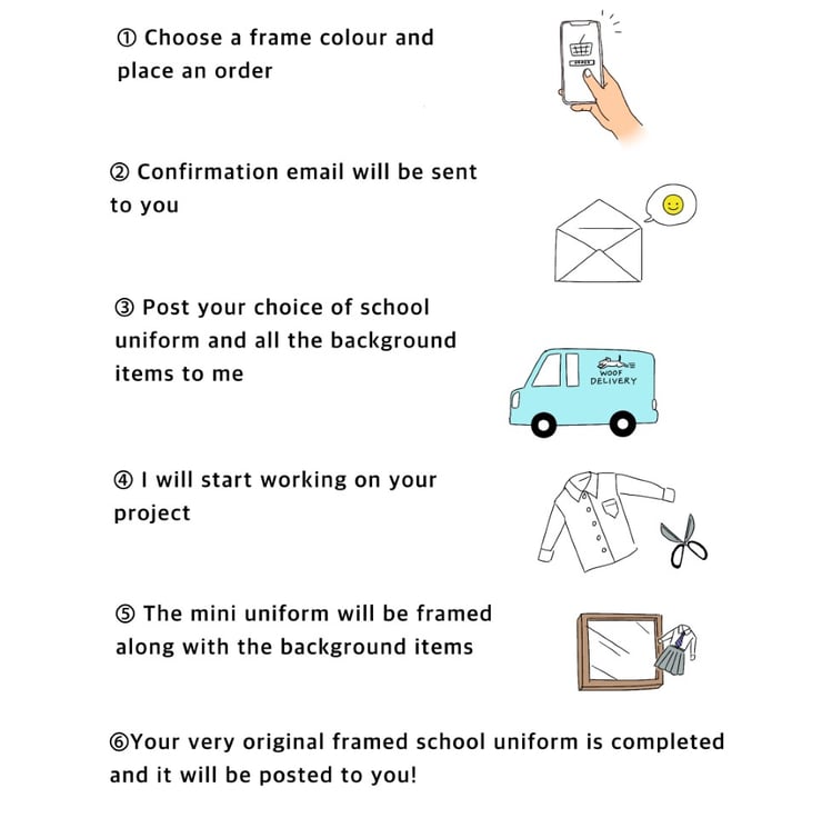 1. Choose a frame colour and place an order. I will send you an instruction on how to post your uniform to me. Traceable postal services such as Royal Mail tracked is strongly recommended.