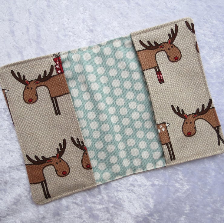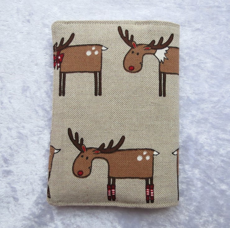 It is made from a medium weight cotton/linen fabric, with a reindeeer design.
