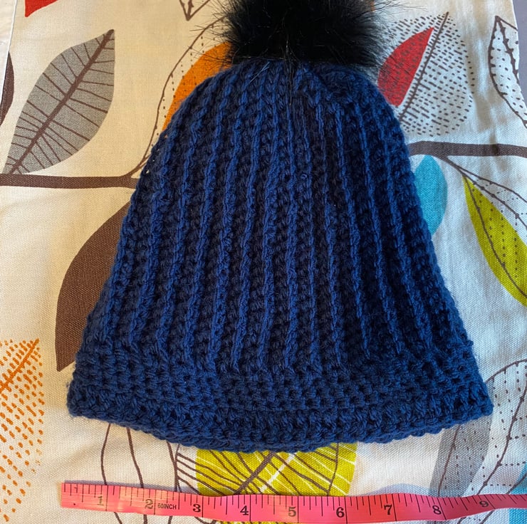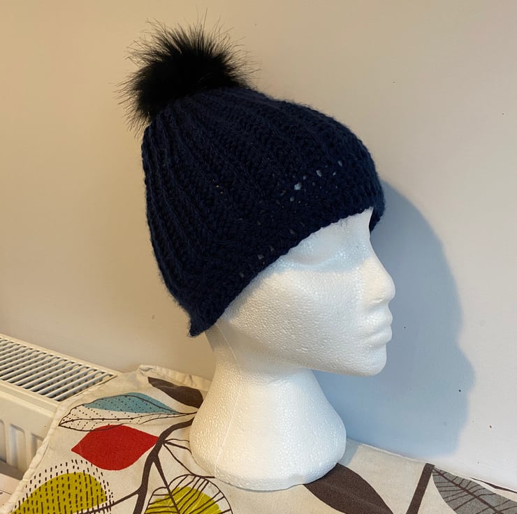 Hand crocheted ladies beanie hat. Chunky navy acrylic yarn, slightly slouchy. Pom can be removed for washing hat if required. Unique , one off piece.