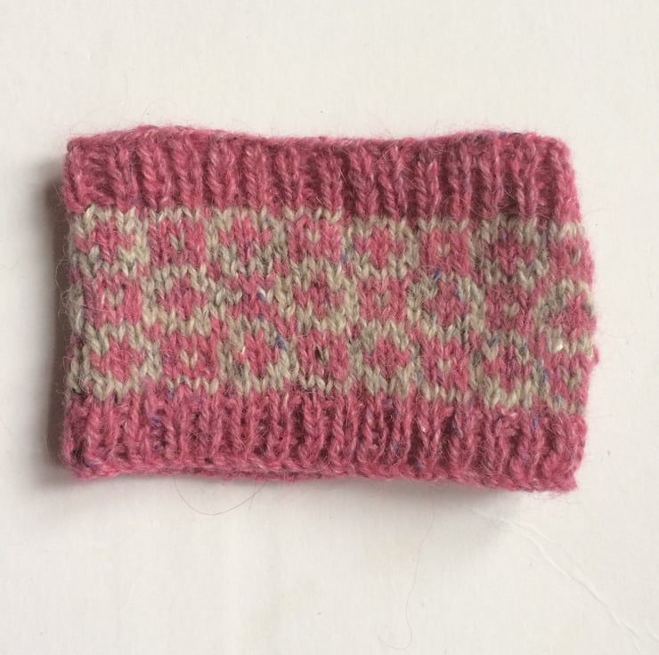 Sheep Mug cozy , handknit fair isle cup cosy . The geometric design to me looks like rows and rows of sheep :) don't you think? . Lovely 100% wool mug hug . Gorgeous kitchen gift. This is a small size mug cosy in pink and cream