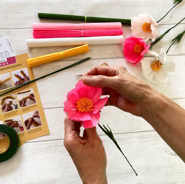 Paper flower making is the most joyful and easy hobby - anyone can do it and the results are amazing! Discover the art of making crpe flowers with this pretty paper cosmos kit for adults.