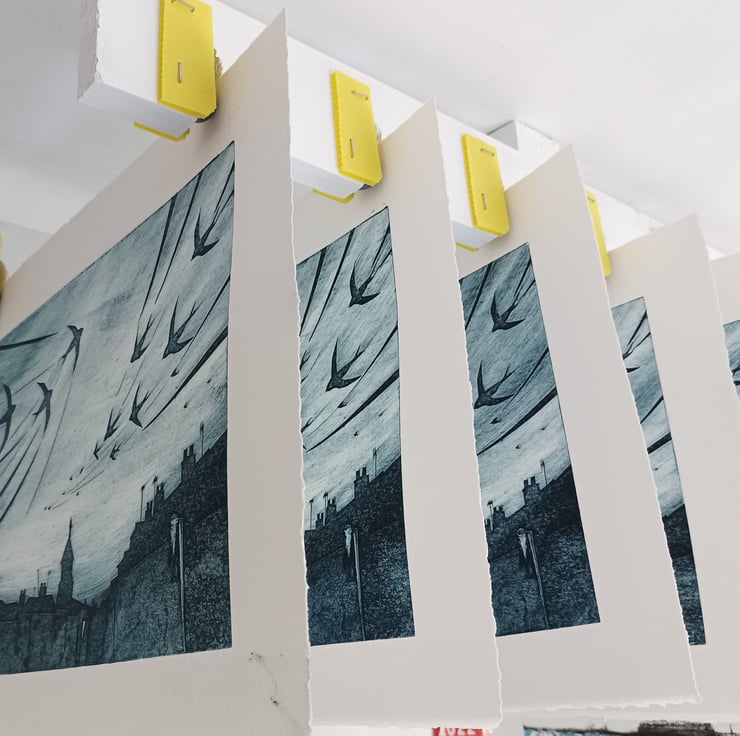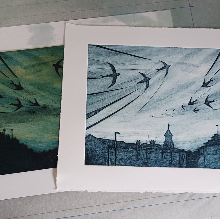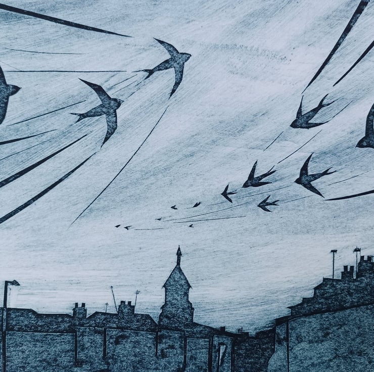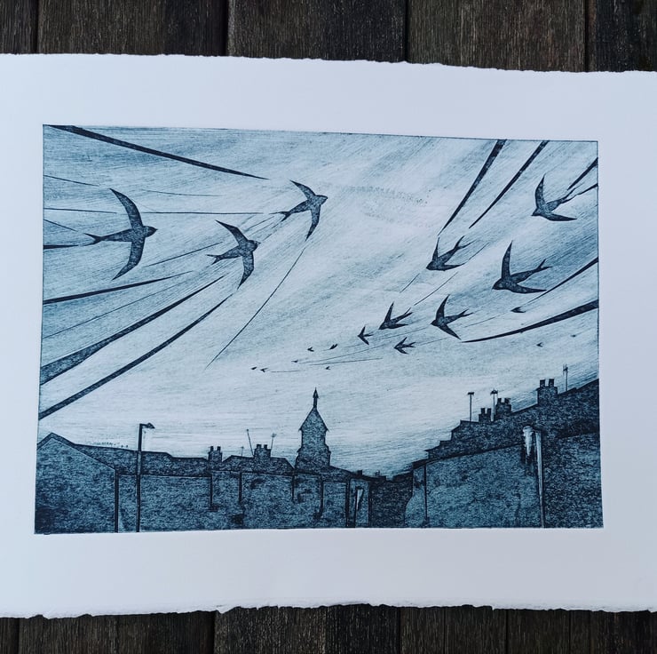 This print is a hand pulled Collagraph. This print brings together 2 of my favourite things - the view from my house and Swifts who can sometimes be seen flying overhead just before the light changes.