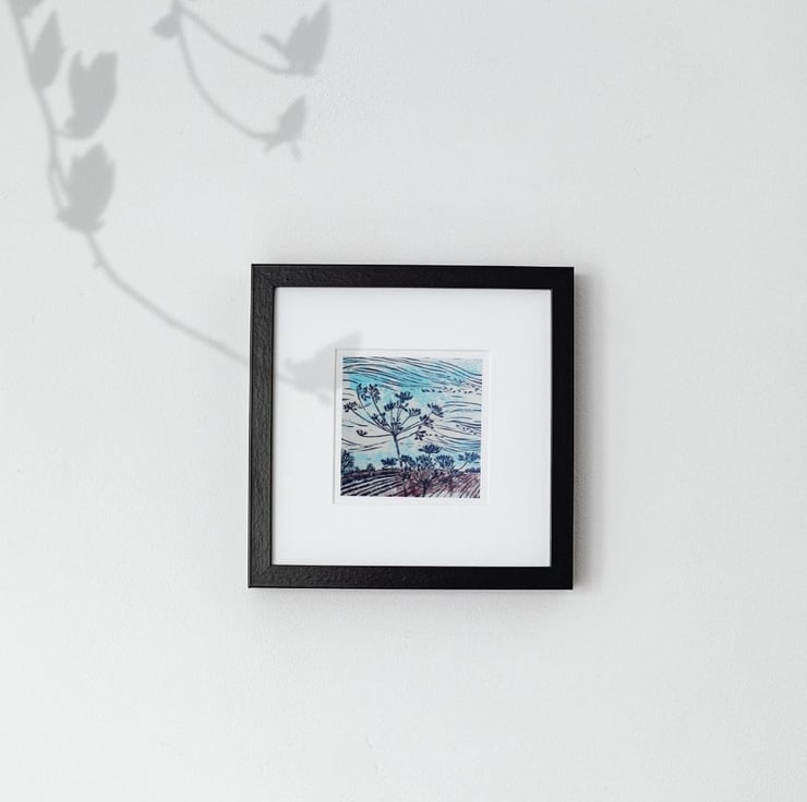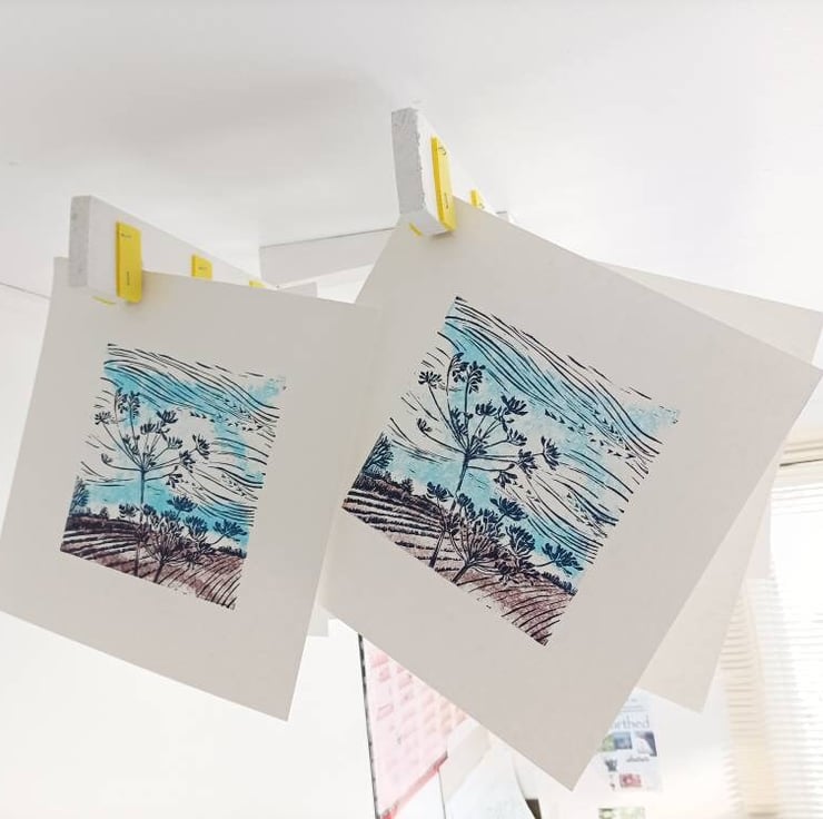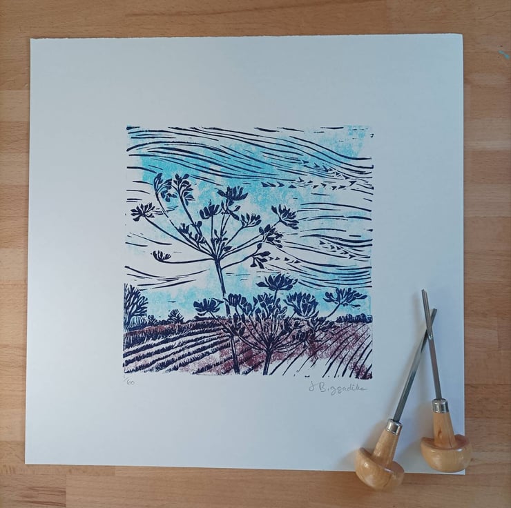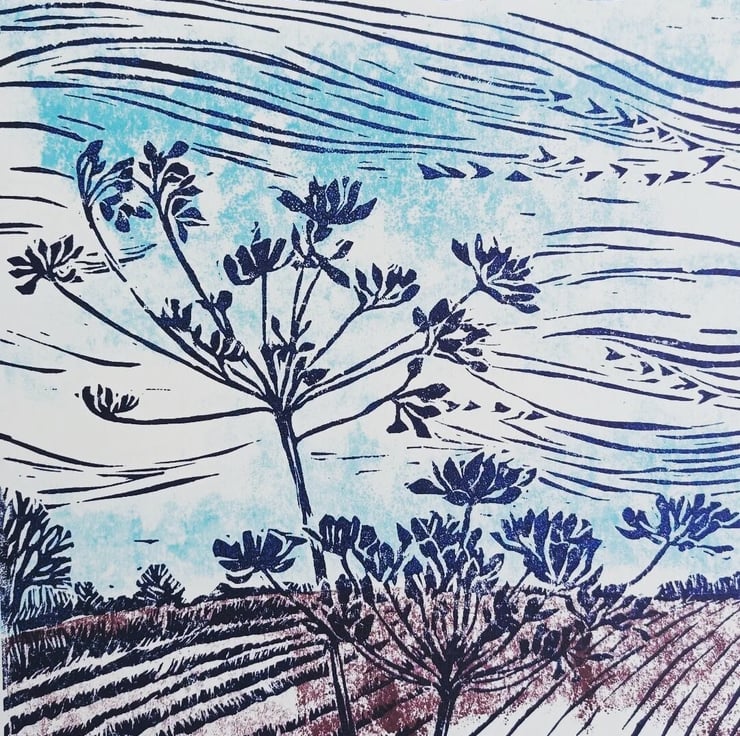 Hand printed linocut inspired by my walks during the late Summer as Autumn arrives. Change is in the air and the Cow Parsley seed heads sway in the late summer breeze.