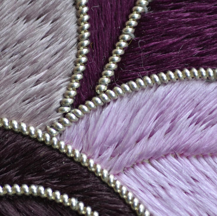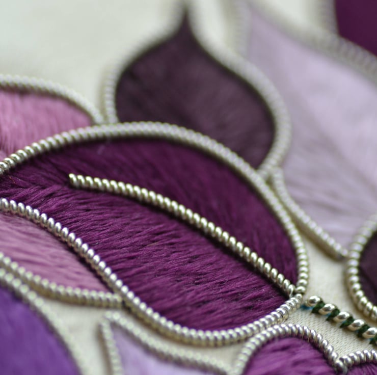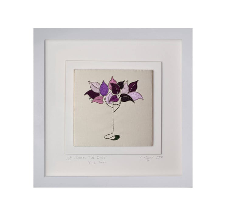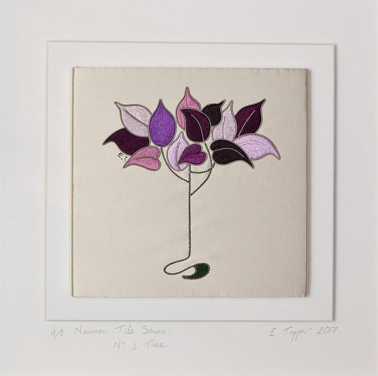 This hand embroidered tree was designed with the Art Nouveau style in mind. The art work features a stylised tree worked in silk floss and metal thread on a satin background. The silk flosses. which are made to order by a small family run business of silk throwsters, are in a range of pink, purple and mauve shades for the leaves and green silk floss for the root of the tree. Metal thread in a beautiful silver plated pearl purl, produced by one of the only two remaining metal thread manufacturers in the UK, has been used for the tree branches and leaf outlines. The silk floss with its lovely sheen, combines beautifully with the silver metal thread.