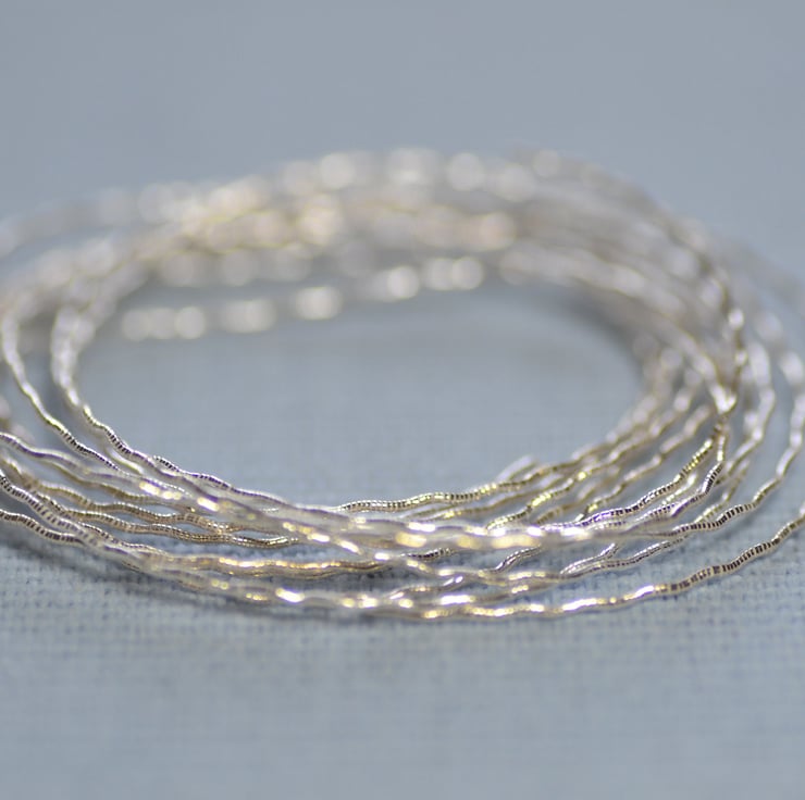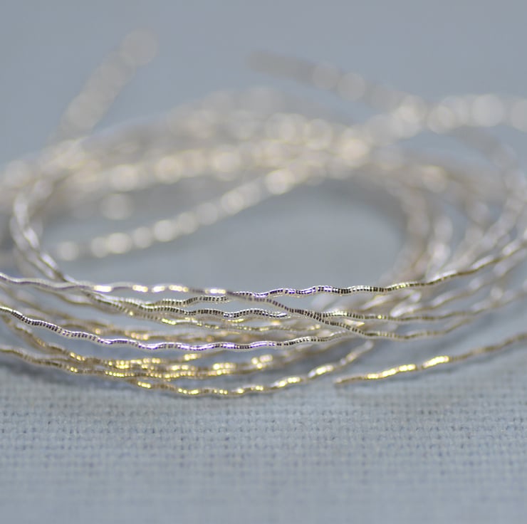 A wavy silver thread for metal thread work and embroidery projects.