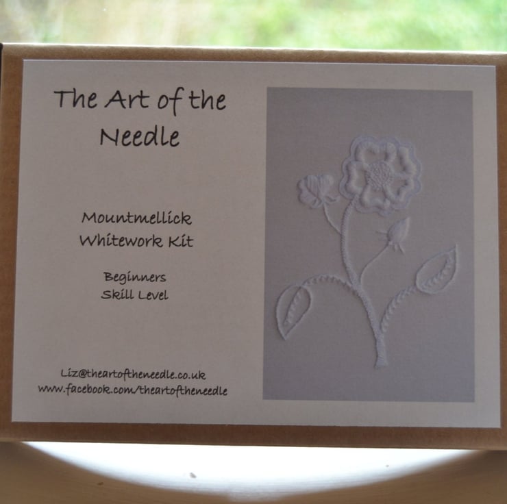 This pretty rose kit comprises a 33cm x 33cm square of white cotton satin jean fabric, the traditional Mountmellick threads in three thicknesses, a hand transferred design, full instructions with stitch guide, diagram and photos, and a chenille needle. All kept tidy in a neat little box. The finished embroidery measures 14cm high by 11.5cm wide.