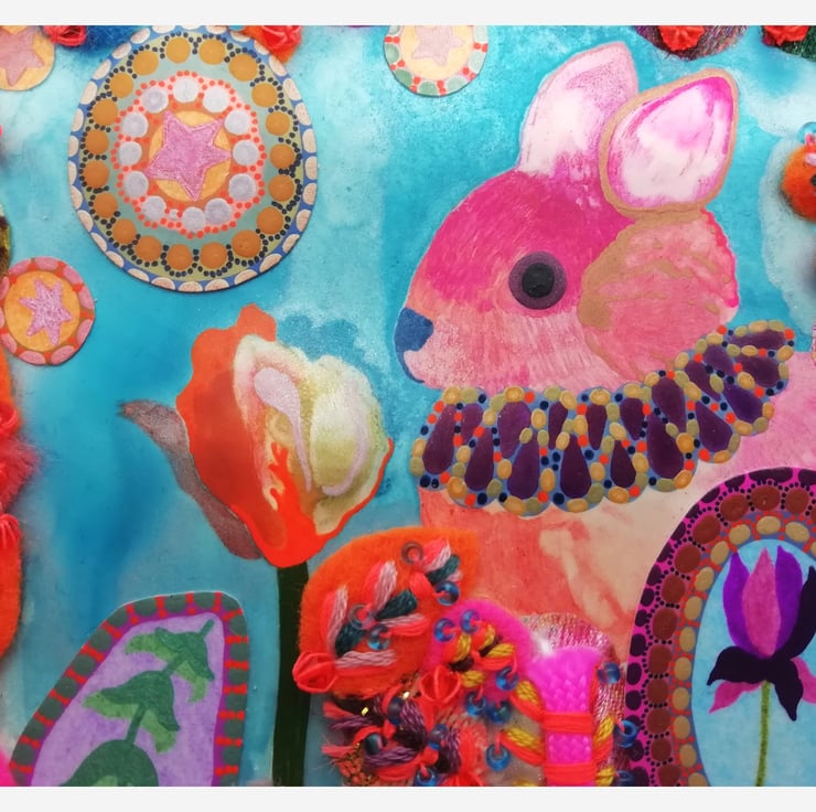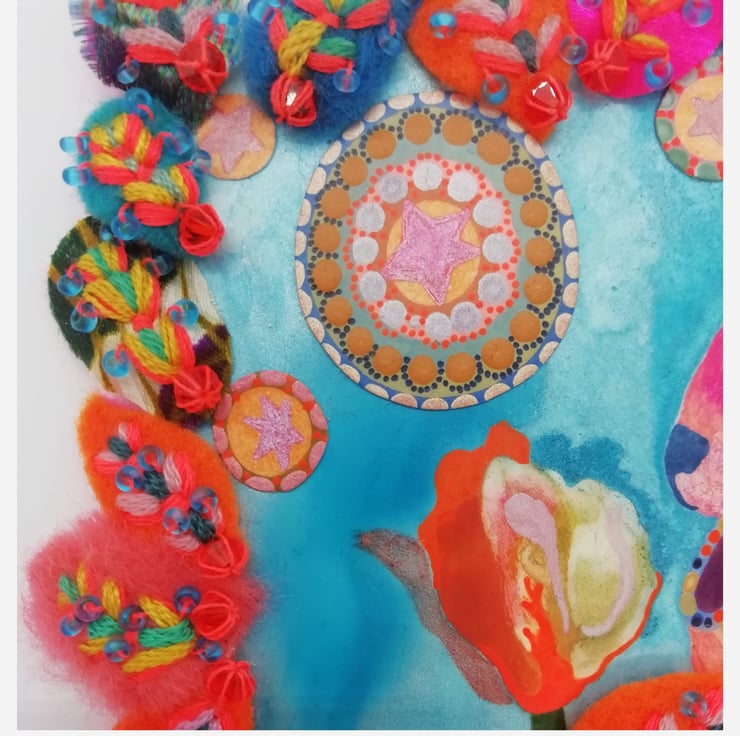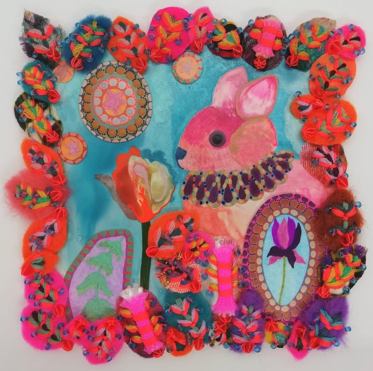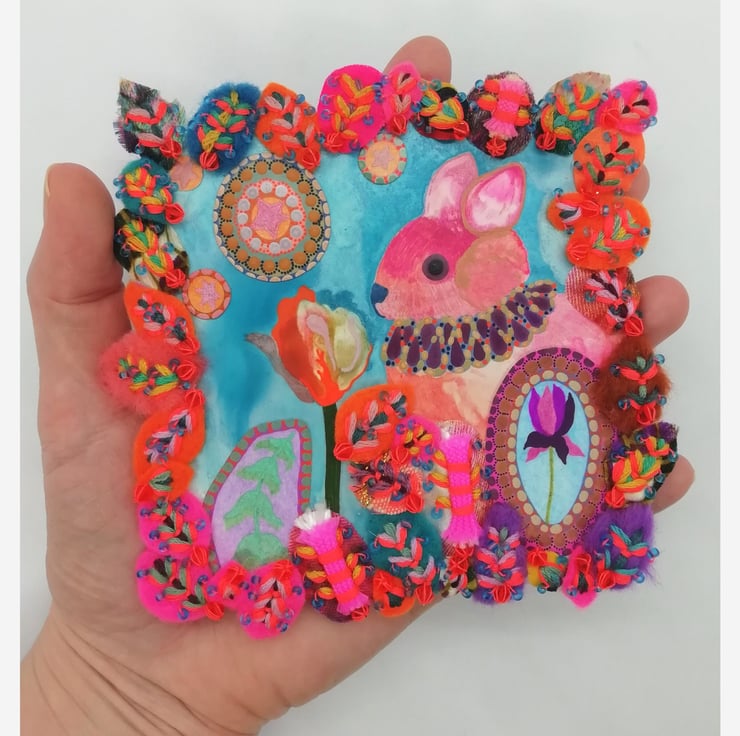 Another miniature, this mixed media artwork has been made on a 4" x 4" Ampersand panel. The hand-stitched sections mean the widest points are as follows: maximum height 5", maximum width 5", and in some places, the maximum depth is 0.4"
