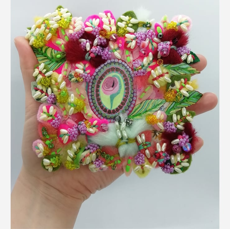 Whilst the base is a 4" x 4" canvas panel, the fabrics surround the edges making the maximum height 5.1", maximum width 5.4", and in places, the maximum depth 0.6". This is indeed another small piece, please see the photo of the artwork in my hand to help you get an idea of the size