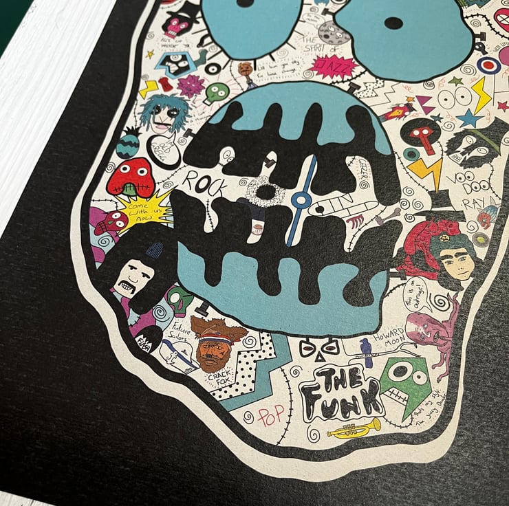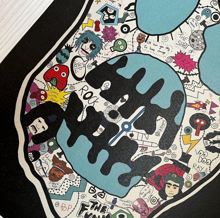 Original drawing I created using graphic fine liners. I then scanned the drawing onto my iPad and digitally painted over in Adobe illustrator. I used the Mighty Boosh logo as the outline and filled the inside with illustrations, iconic Boosh quotes and funny scenes.