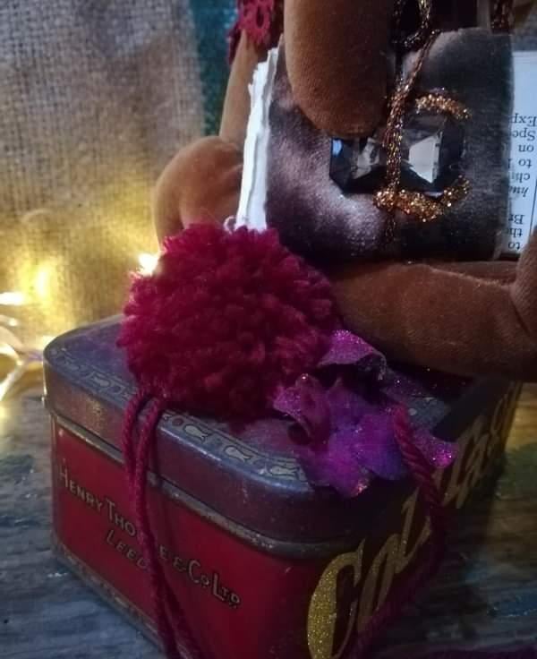 This piece sits on top of a lovely worn vintage red tin, I love making these creatures on old tins as they make lovely display / art pieces.