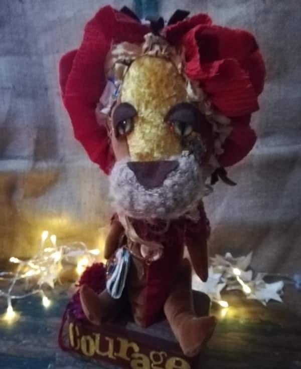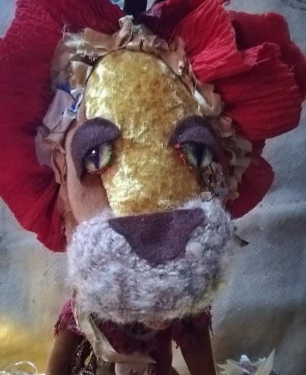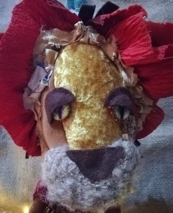A textile art Lion sculpture made in lots of rich vintage velvets and textiles.