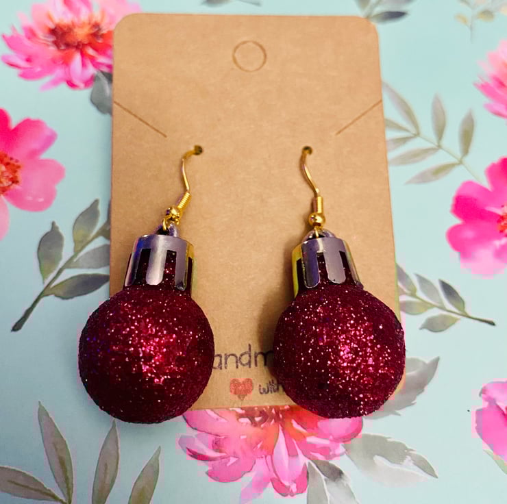 Hand made glitter deep red Christmas bauble dangle earrings.
