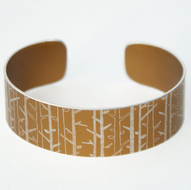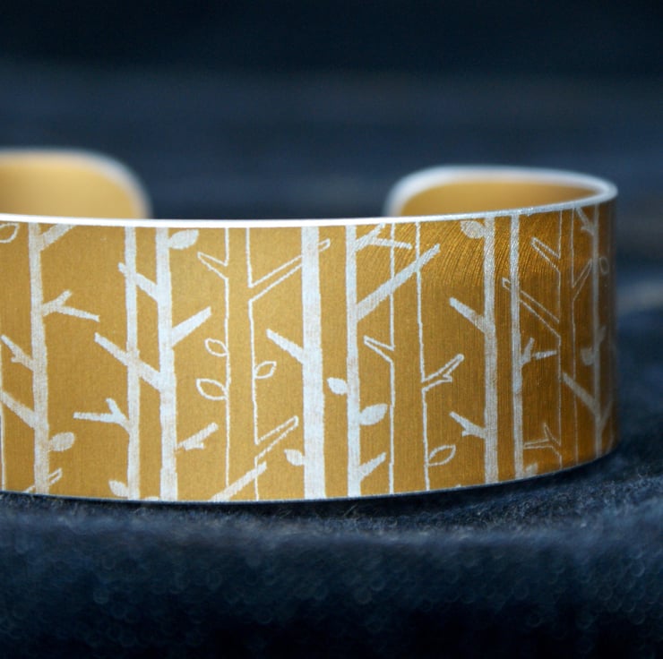 A stylish bracelet/narrow cuff made from anodised aluminium with a print of stylised trees. I drew this pattern digitally, made it into a resist and applied it to the metal. I then dye the aluminium, seal it and remove the resist which leaves the pattern showing in the original colour of the metal. The cuff is then made using traditional metalworking techniques.