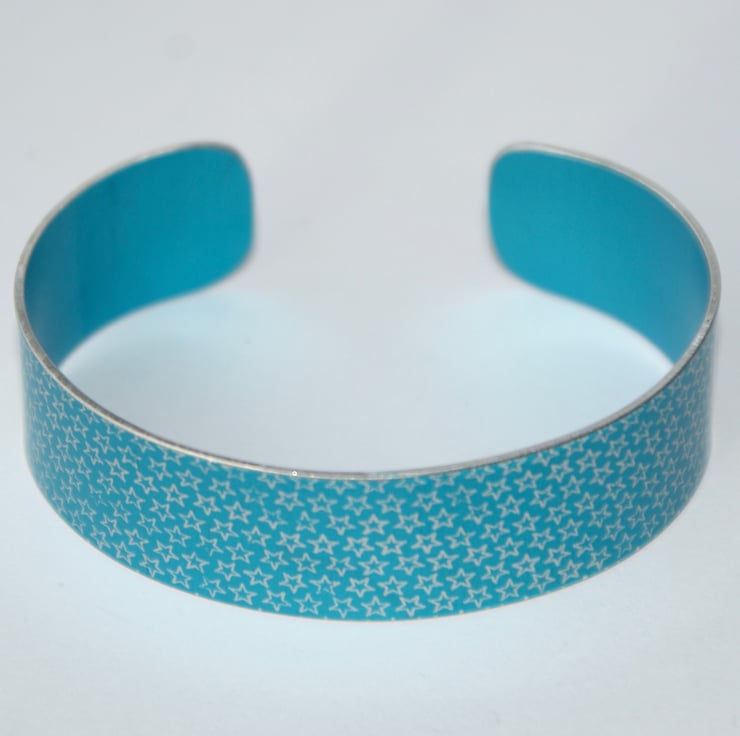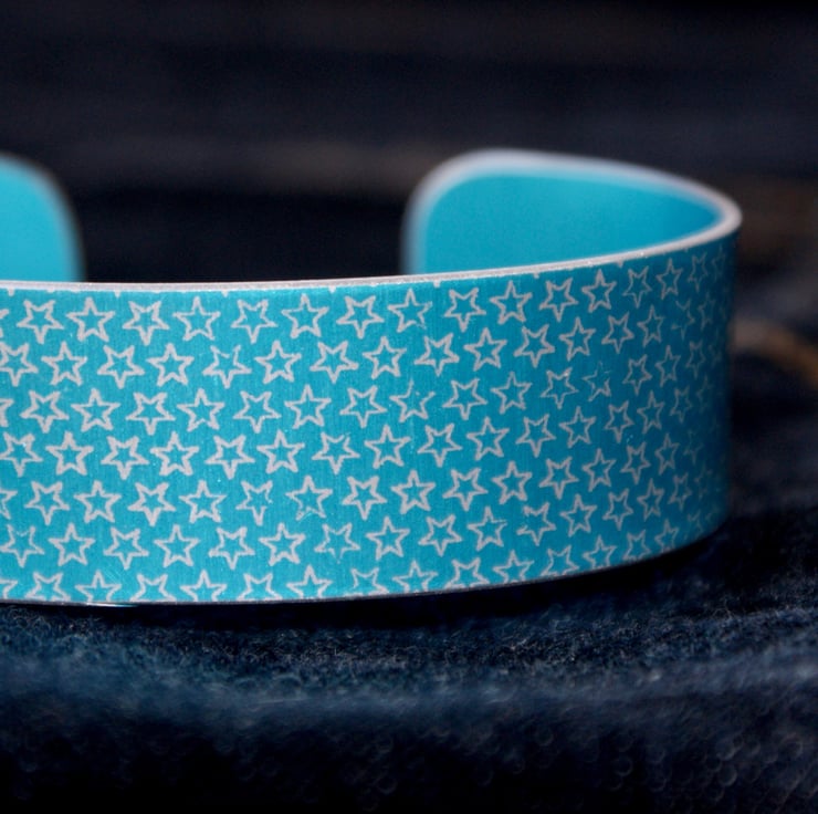 A striking bracelet/cuff made from anodised aluminium with a star pattern designed digitally by me. I made the drawing into a resist and applied it to the metal. I then dye the aluminium, seal it and remove the resist which leaves the pattern showing in the original colour of the metal. The cuff is then made using traditional metalworking techniques.