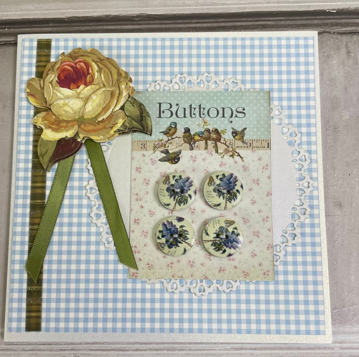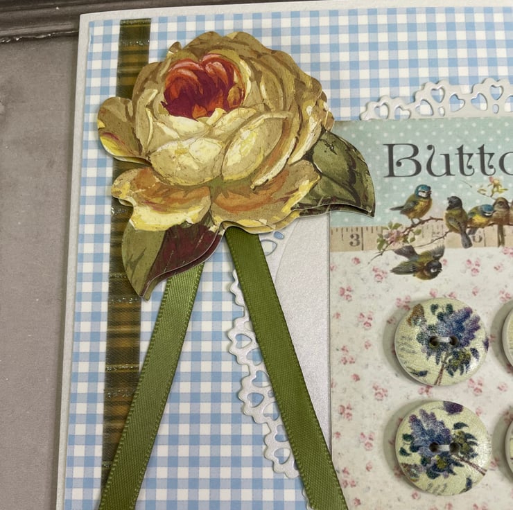 A pretty 14.5 cm square pearl card, with a die cut pearl paper doily. Stripy ribbon running down the side with an Anna Griffin 3D rose die cut and green satin ribbon. Blank insert inside for your own message. White envelope provided.