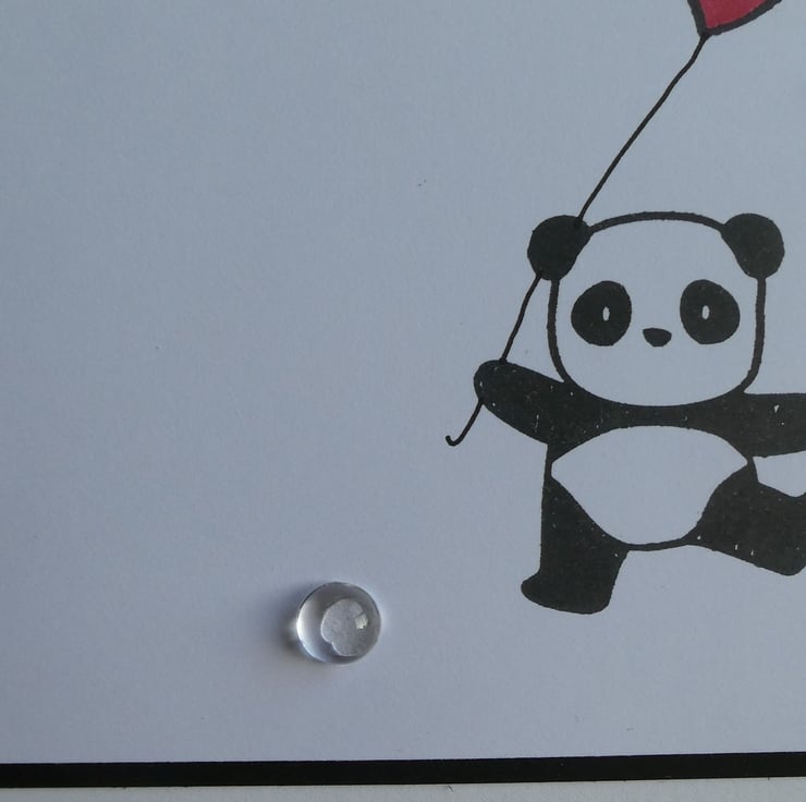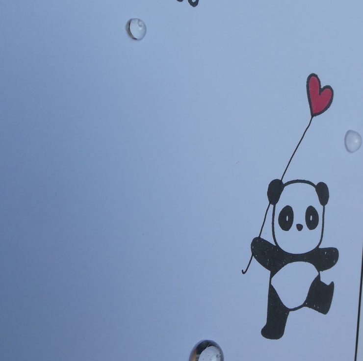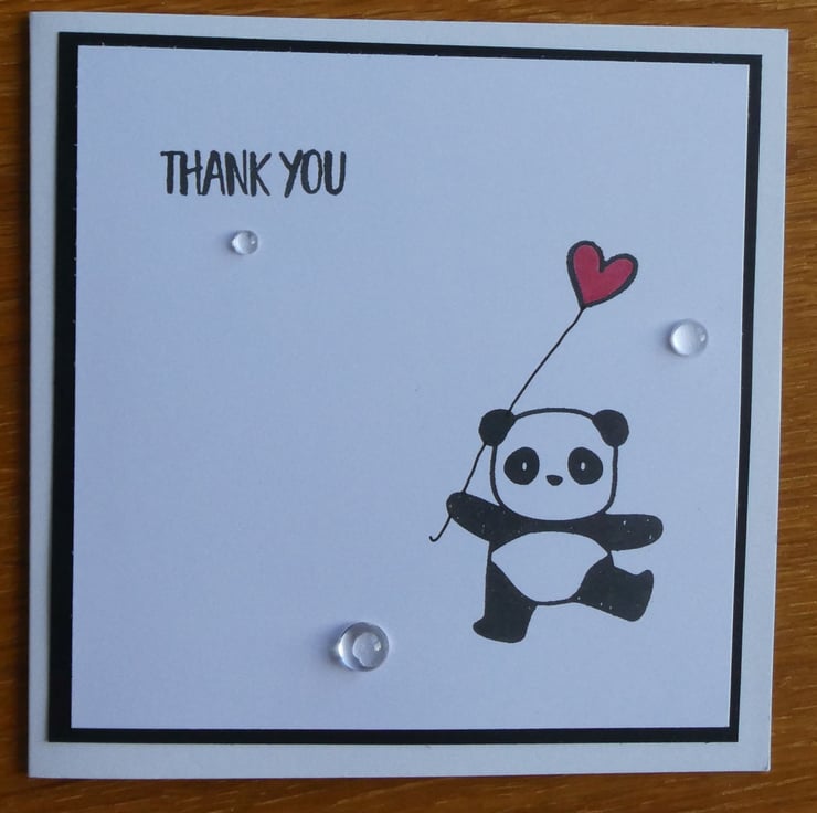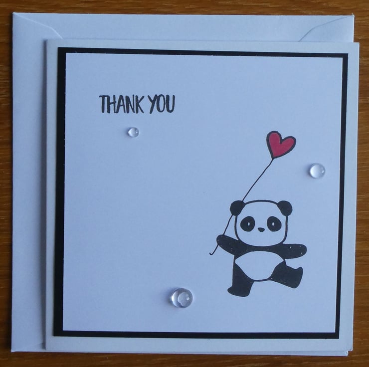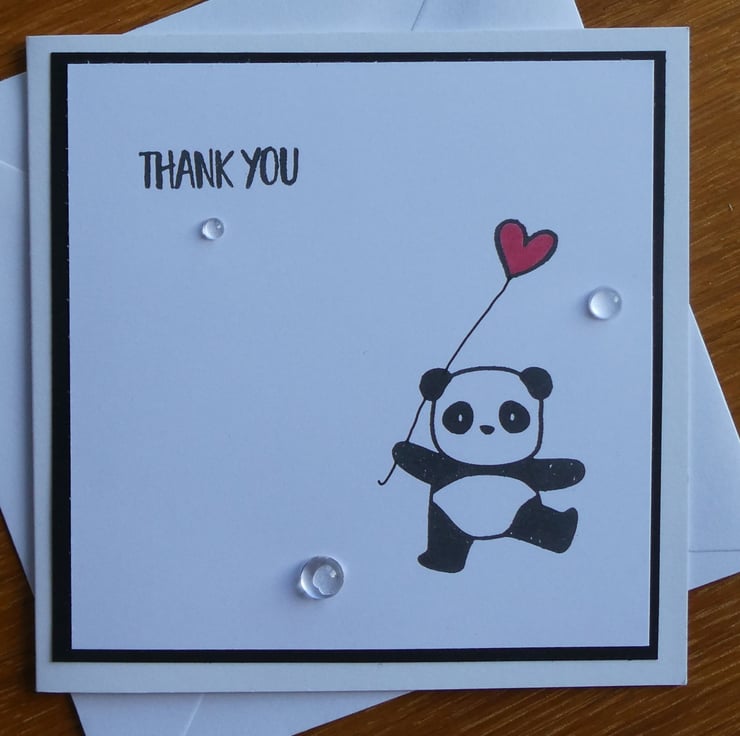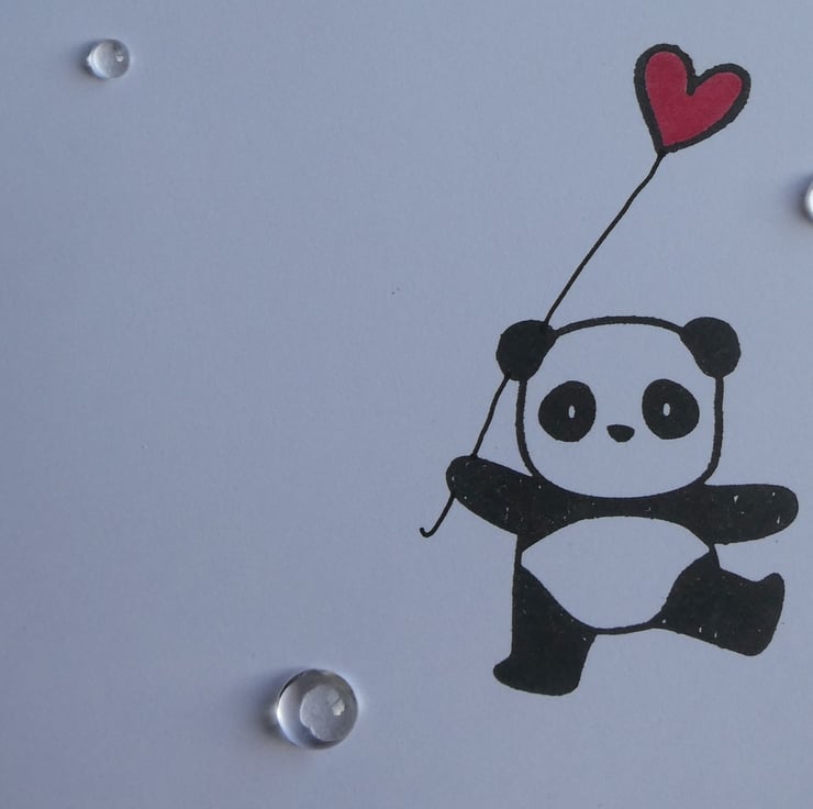 This cute thank you card features a hand stamped panda standing on one leg holding a red heart shaped balloon.