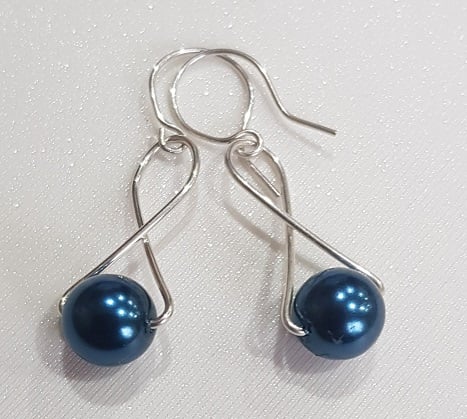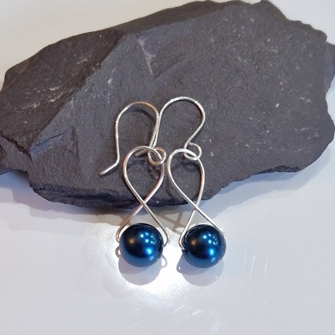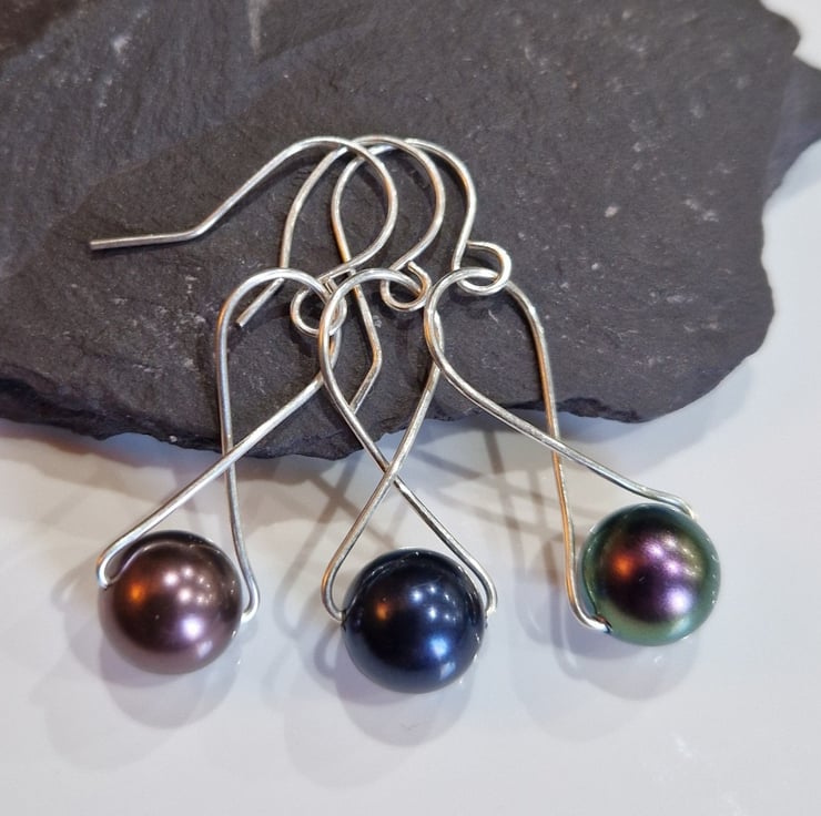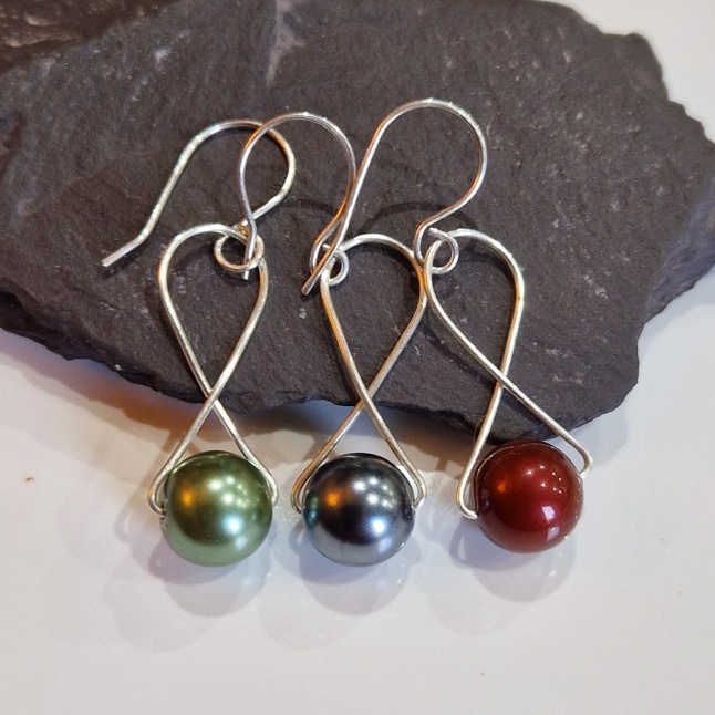 I love silver and glass pearls together, and have made several items using these lovely Swarovski pearl beads like these. The simple sterling silver wire settings show the colour and shine of the beads off beautifully. I also hand make the wires for my earrings.