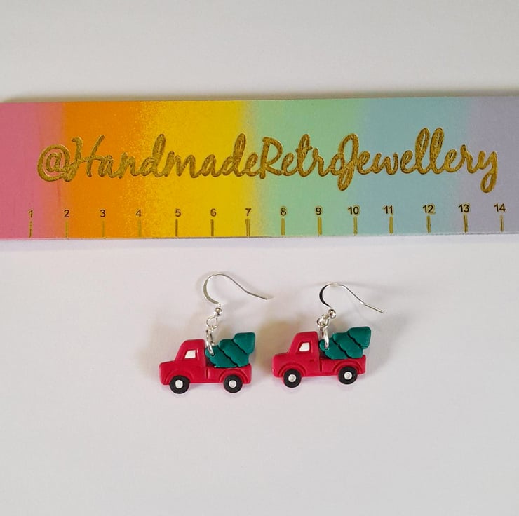 Beautiful and delicate car themed Christmas earrings, carrying the all important Christmas tree home to decorate!
