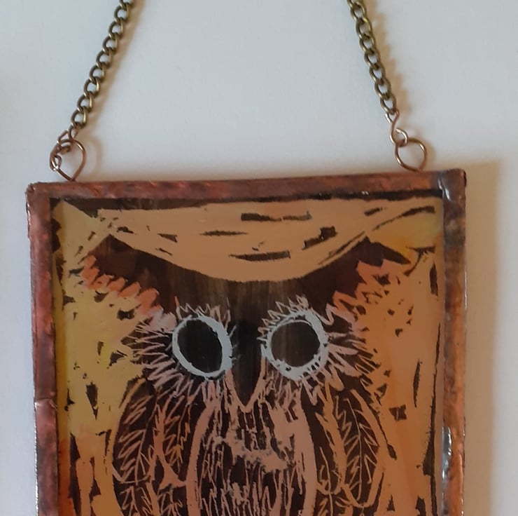 Made using the reverse glass painting technique where the back of the glass is painted black then etched out. The colours are then added behind.