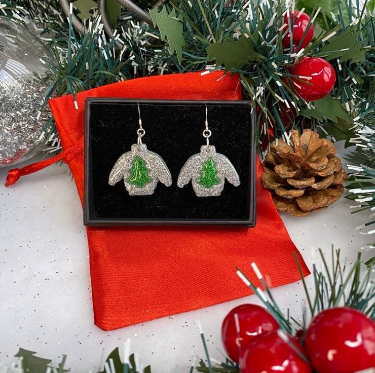 Handmade with resin and ultra fine silver glitter for the jumper and green glitter for the Christmas tree motif these are a sparkling pair of unique and quirky festive earrings.