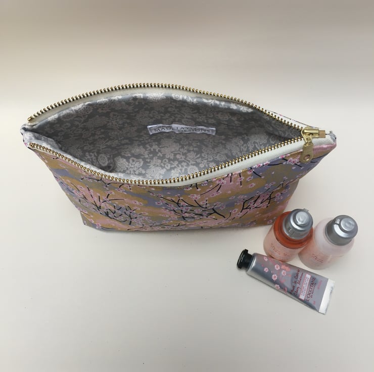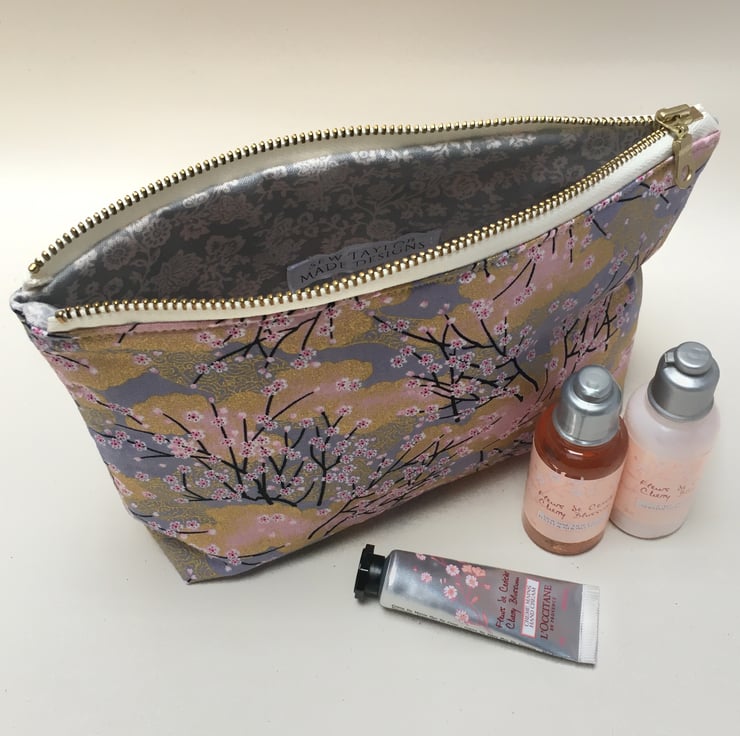 A gorgeous lilac Japanese fabric has been used to create a timeless pouch that's lined with Liberty fabric.