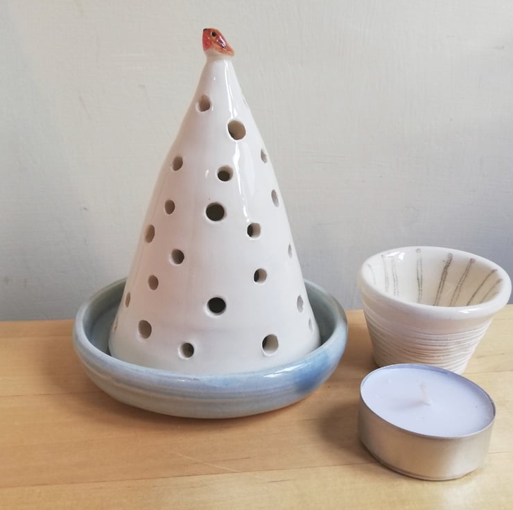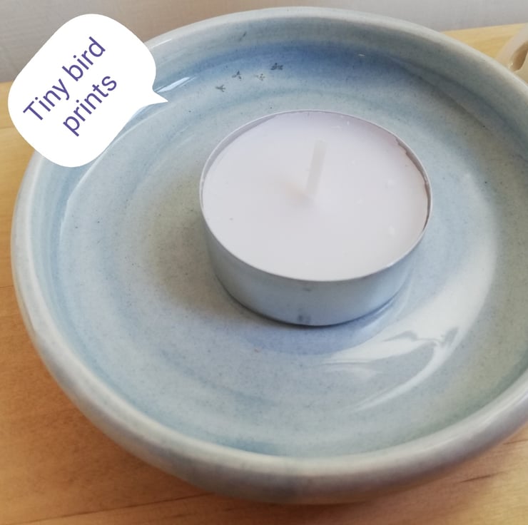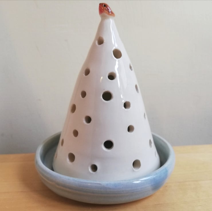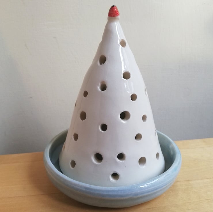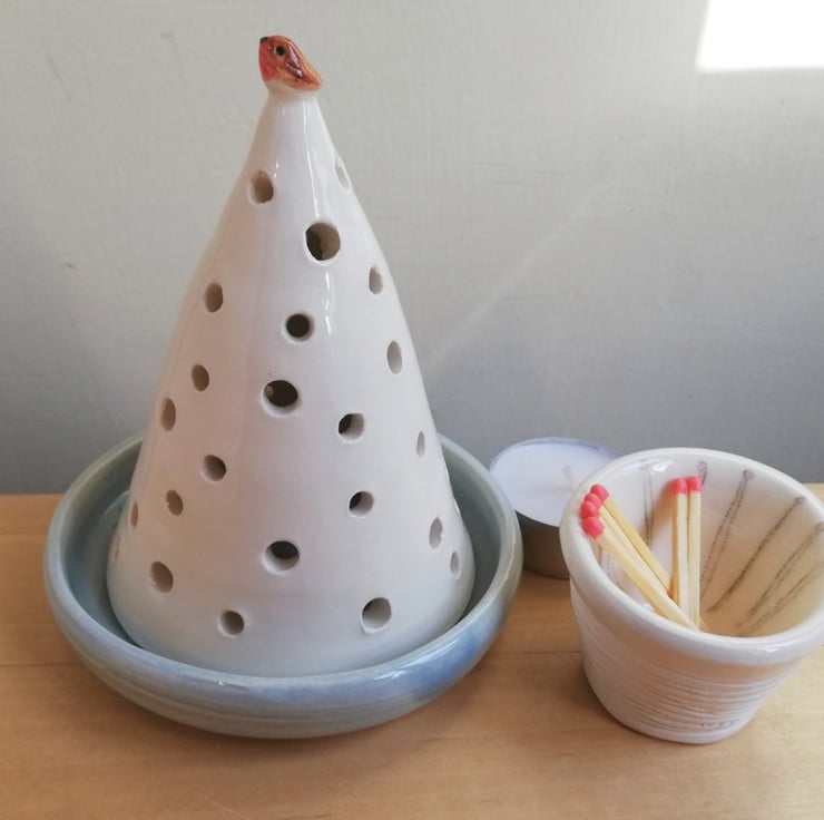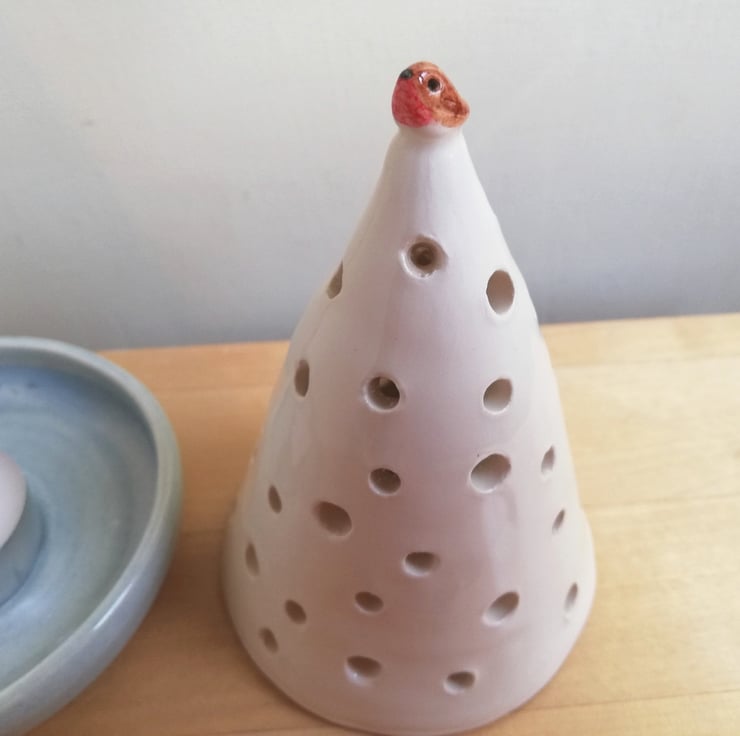 This little tree was thrown on my wheel and the little robin was modelled and attached. Little holes were punch through the clay to allow light from a tealight candle to shine through. Little bird prints were etched into the saucer. Once bisque fired the piece was hand painted and glazed with lead free glaze before the final firing.