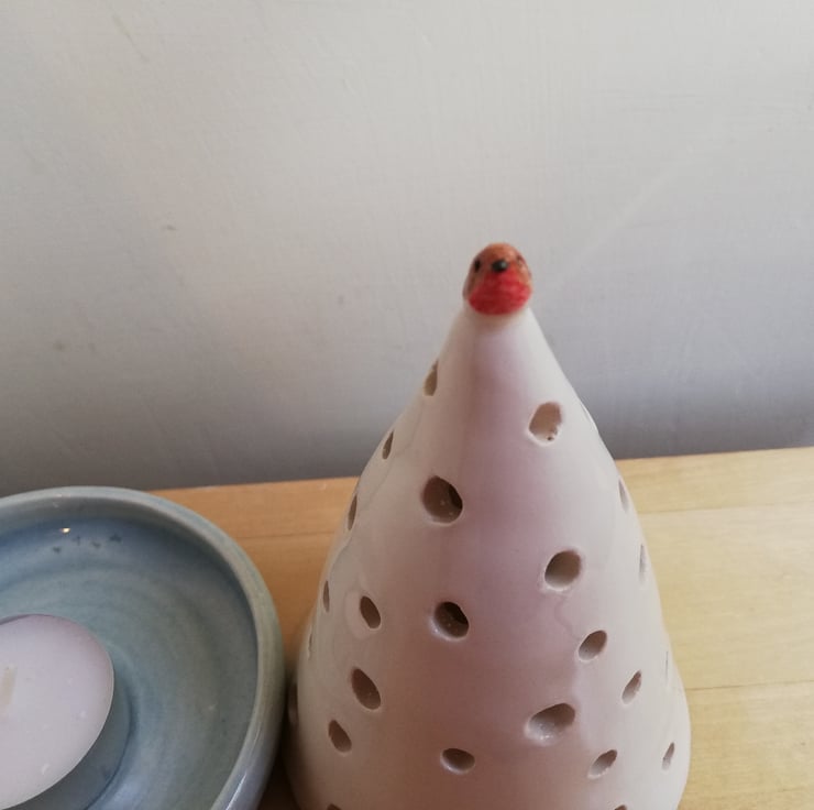 Handthrown christmas tea light holder with tiny hand painted robin on top and clear and grey glossy glaze .