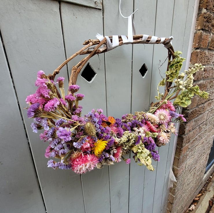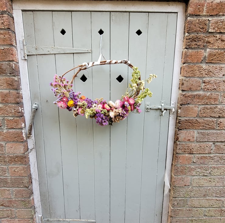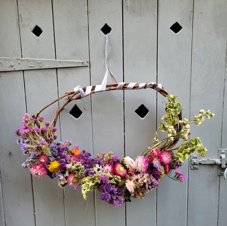 Selection of summer flowers dried and incorporated onto wreath