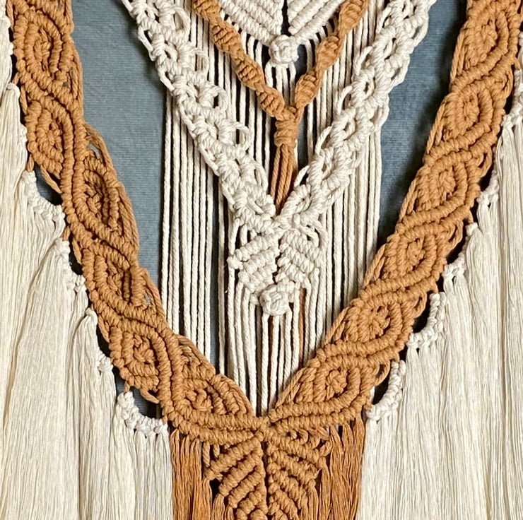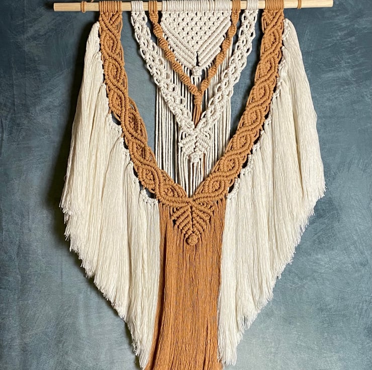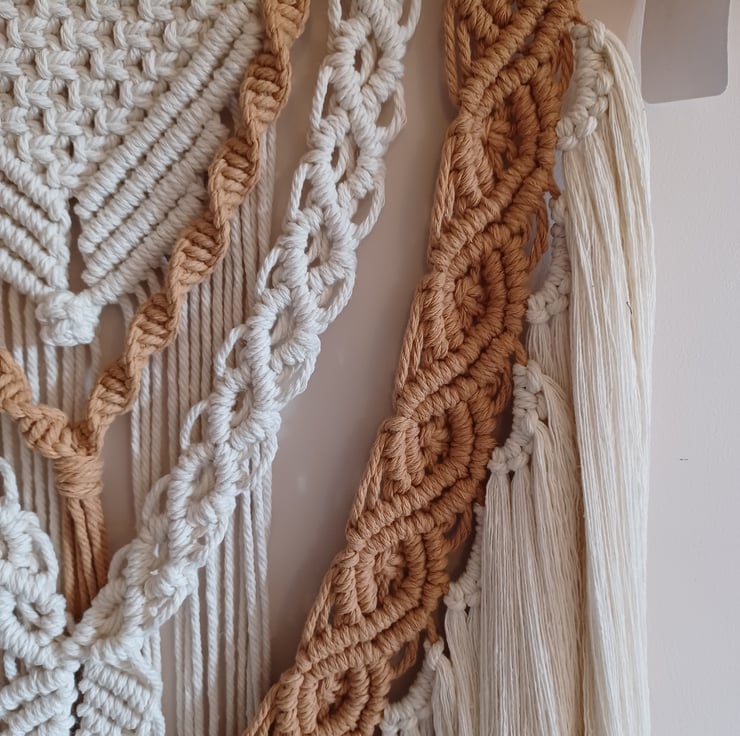 A striking macrame wall hanging which is made from soft caramel and beige coloured cotton cord. Carefully crafted using a series of different knotting techniques, these intricate patterns ultimately come together to create a beautiful design. This wall hanging starts as a length of dowel hanging off a metal rail with varying lengths of cord attached. It hardly requires any other tools other than my hands, and the knowledge of many different knotting techniques. Certain knots use up more cord than others, so I need to be careful to have the correct lengths of cord in the right place and order to ensure I don't run out of length before the end of the design. Once I'm happy that the cords are all in the correct order I start the knotting process, carefully ensuring all the knots are equal and even as I work across the pattern. Finally, at the end of the pattern the design is secured with a wrap knot, fringe or tassels and sometimes wooden beads. All tassels and fringes are then carefully trimmed as required. This process takes time, patience and skill. It's also a very meditative and relaxing activity which results in beautiful, stylish pieces of wall art.
