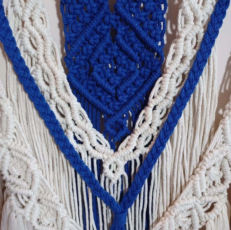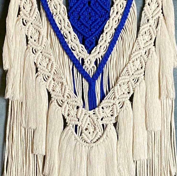 A striking macrame wall hanging which is made from soft blue and beige cotton cord. Carefully crafted using a series of different knotting techniques, these intricate patterns ultimately come together to create a beautiful design. This wall hanging starts as a length of dowel hanging off a metal rail with varying lengths of cord attached. It hardly requires any other tools other than my hands, and the knowledge of many different knotting techniques. Certain knots use up more cord than others, so I need to be careful to have the correct lengths of cord in the right place and order to ensure I don't run out of length before the end of the design. Once I'm happy that the cords are all in the correct order I start the knotting process, carefully ensuring all the knots are equal and even as I work across the pattern. Finally, at the end of the pattern the design is secured with a wrap knot, fringe or tassels and sometimes wooden beads. All tassels and fringes are then carefully trimmed as required. This process takes time, patience and skill. It's also a very meditative and relaxing activity which results in beautiful, stylish pieces of wall art.