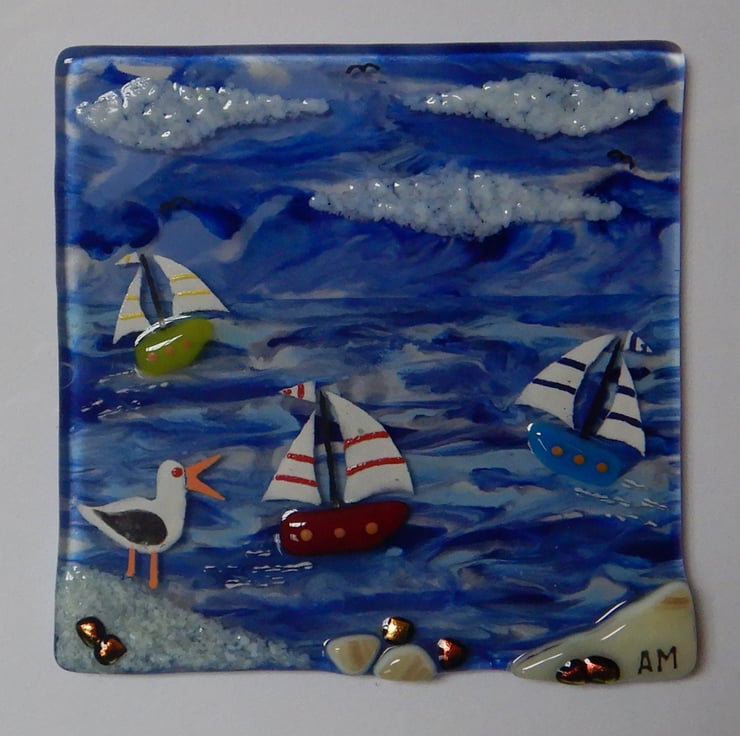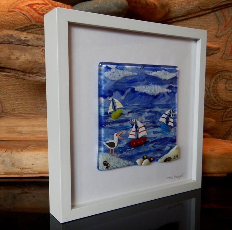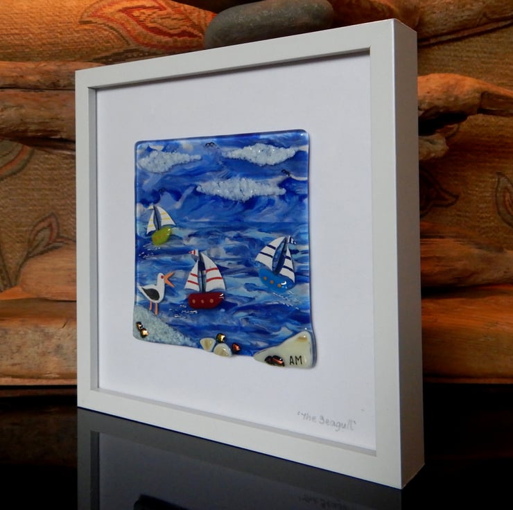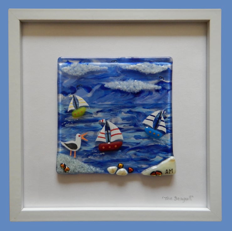 'Seagull' is made completely from glass which has been fused in my kiln. There is no enamel, glass paint or any other materials used, this picture is 100% pure bullseye fusing glass!