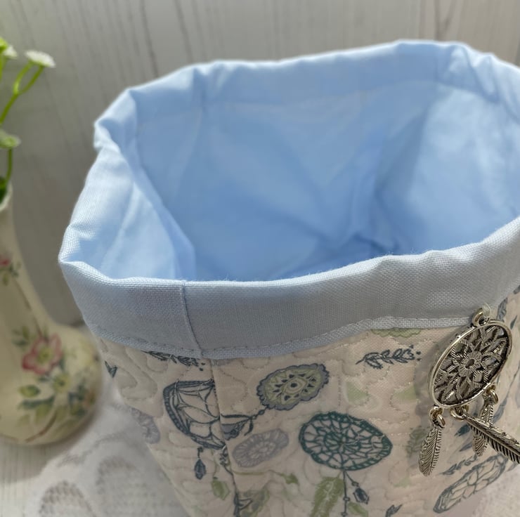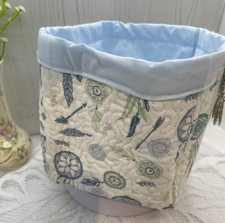 Pretty dream catcher printed cotton. Quilted with swirls, lined with complimenting colour cotton. Dream catcher charm and feathers on the centre front.