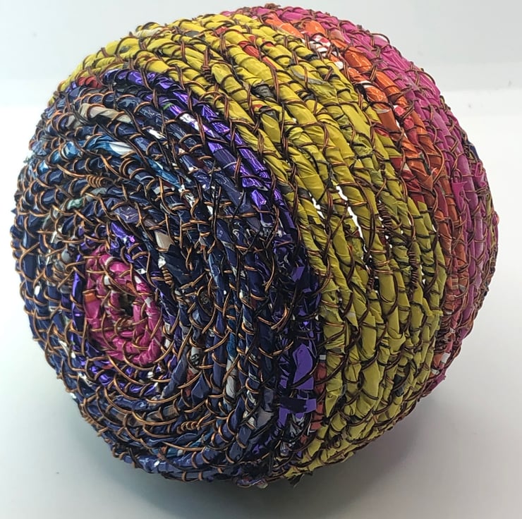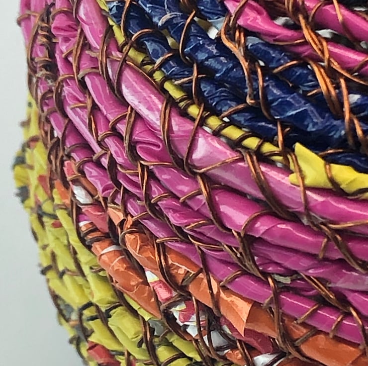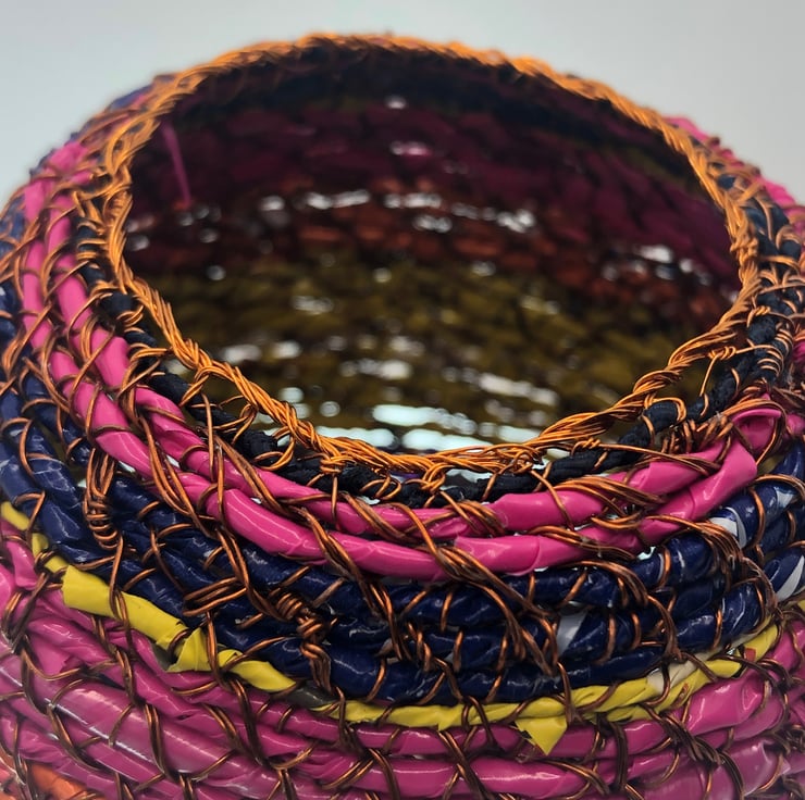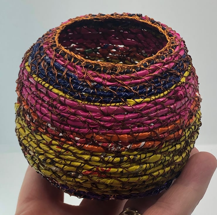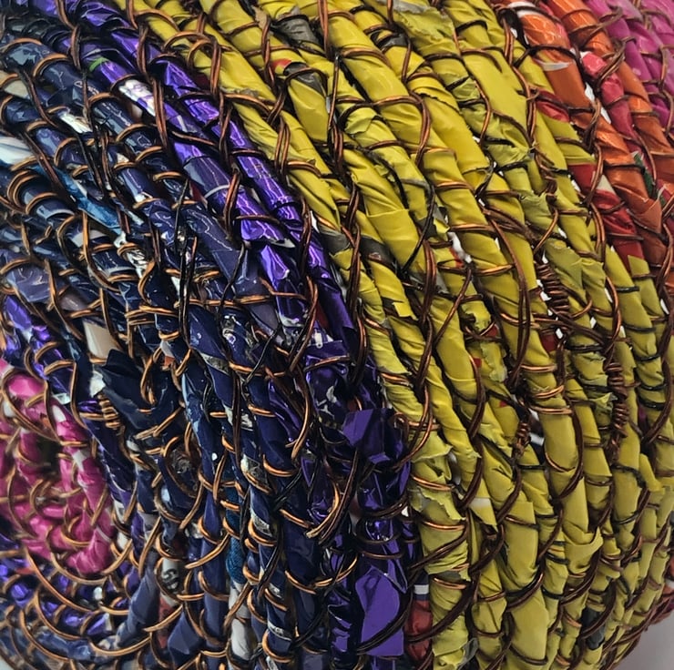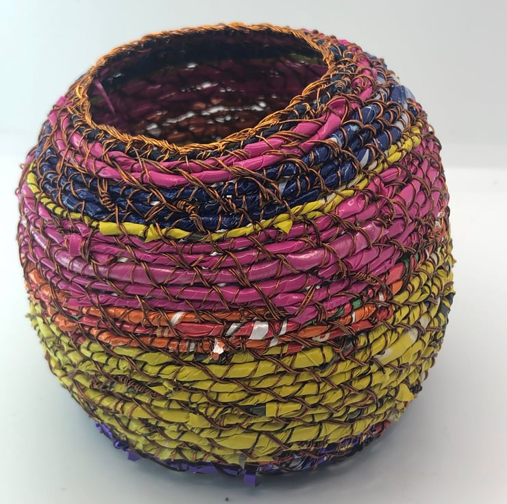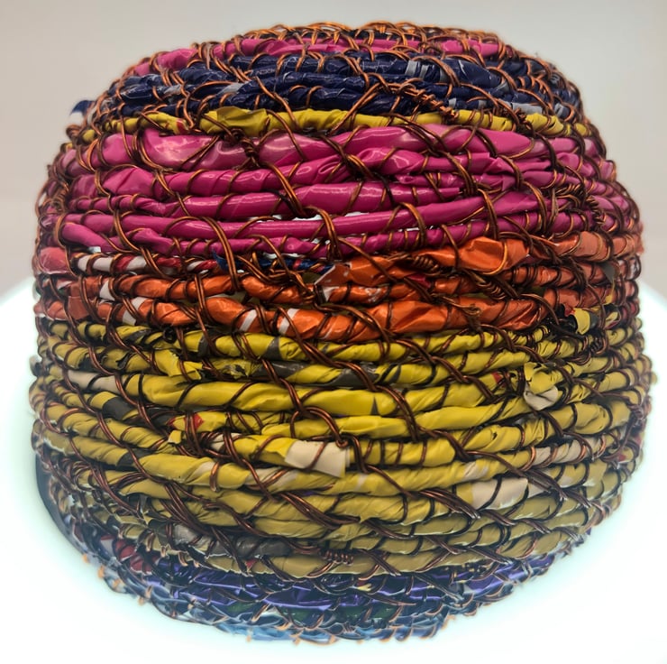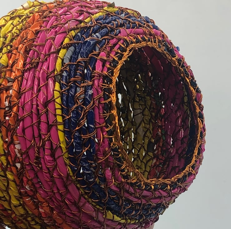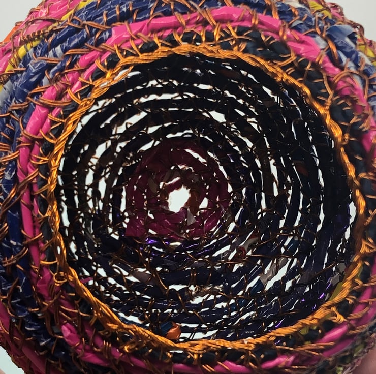 Belly pot from recycled materials by ABScraft - wire reclaimed from televisions, plastic wrappers from bags of chocolate orange/coffee beans/bunches of flowers. Each coil pot is made with no plan and evolves as I construct and as the raw materials present themselves. Each piece is made by hand and many hours going into their creation. I use textile techniques in metal ton construct the structure and "textile" at the same time.