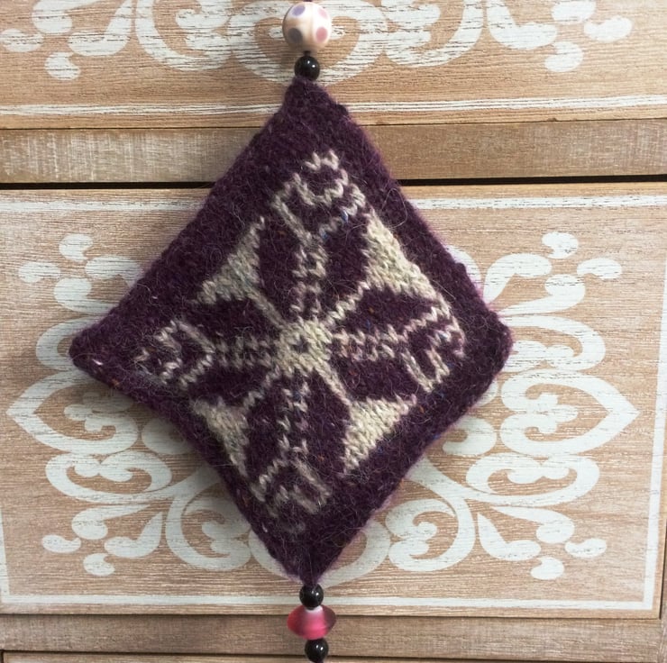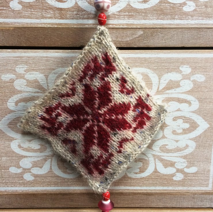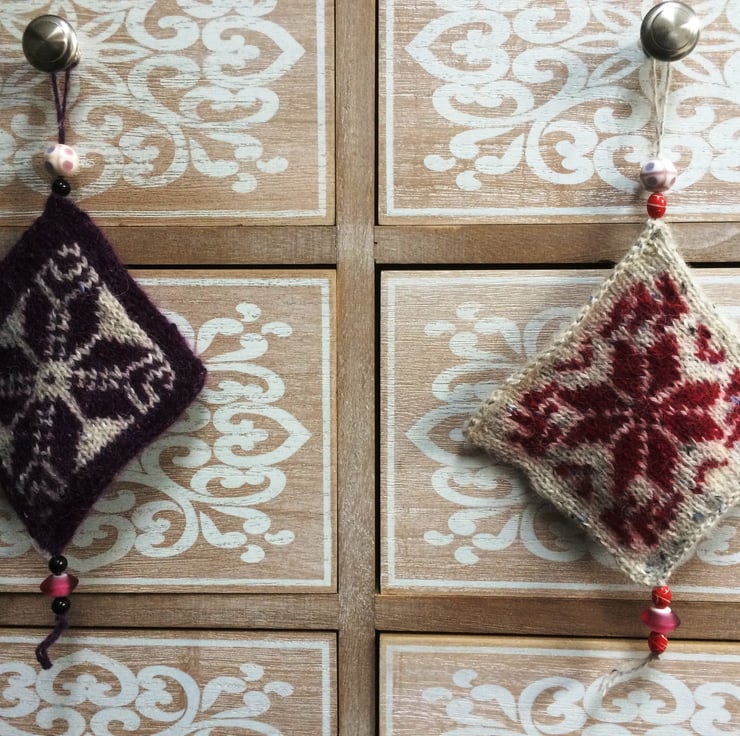 2 x hand knitted fair isle swatch's that have been turned in to a Christmas hanging decoration specially for you. Swatch size is approx 3" x 3" .
