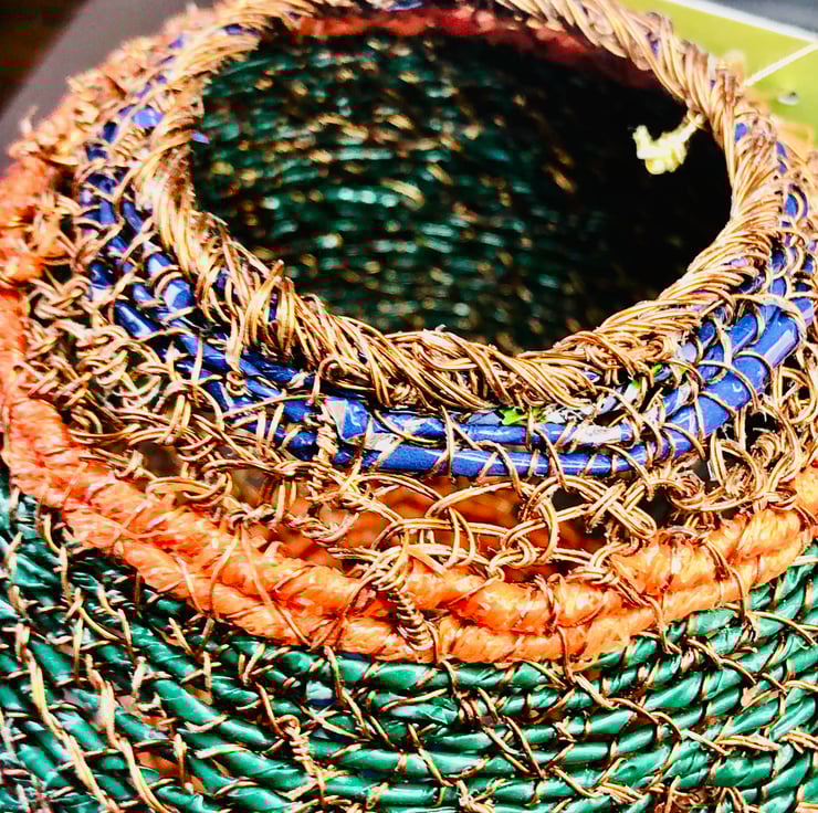 Sold but similar available:Belly pot from recycled materials by ABScraft - wire reclaimed from televisions, plastic wrappers from bags of chocolate orange/coffee beans/bunches of flowers. Each coil pot is made with no plan and evolves as I construct and as the raw materials present themselves. Each piece is made by hand and many hours going into their creation. I use textile techniques in metal ton construct the structure and "textile" at the same time.