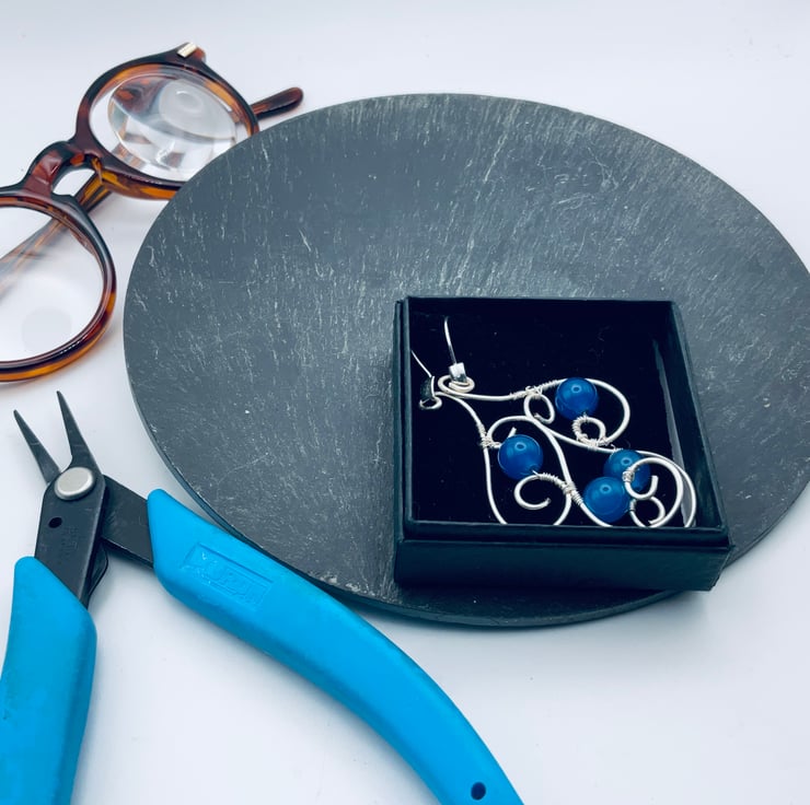 Boxed double scroll dangling earrings with blue agate beads. These make the perfect mini gift or stocking filler!