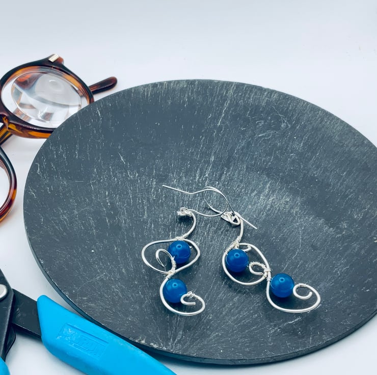 Boxed double scroll dangling earrings with blue agate beads. These make the perfect mini gift or stocking filler!