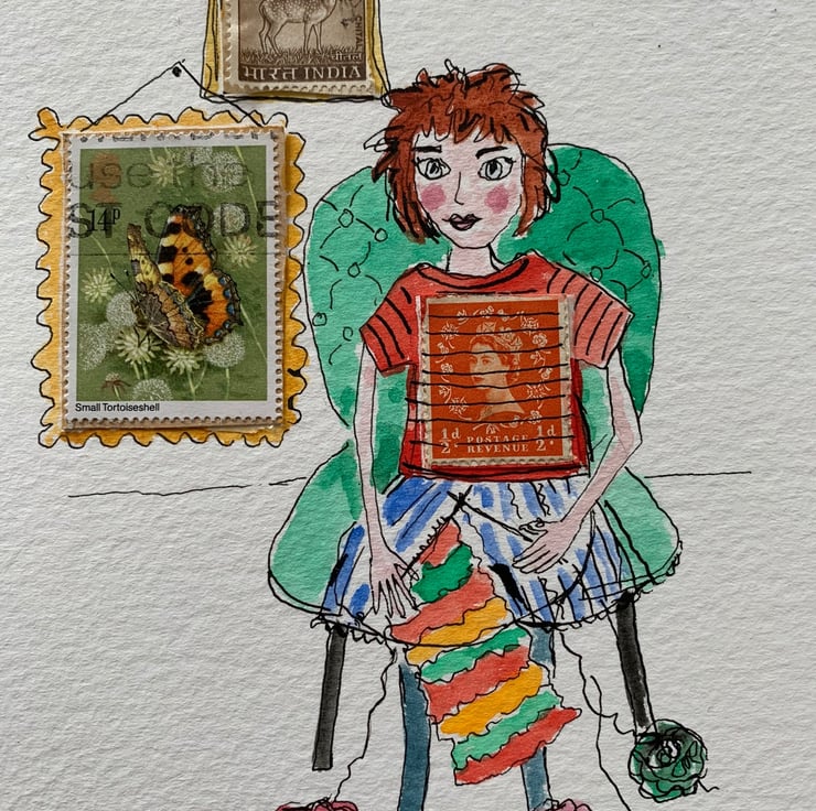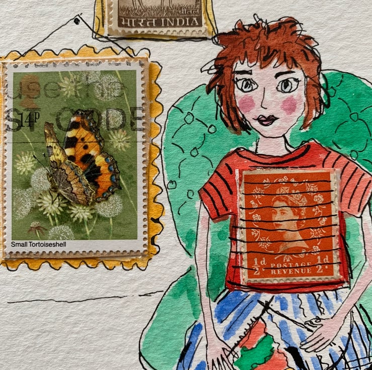 A small mixed media using vintage postage stamps, watercolour and ink pen.